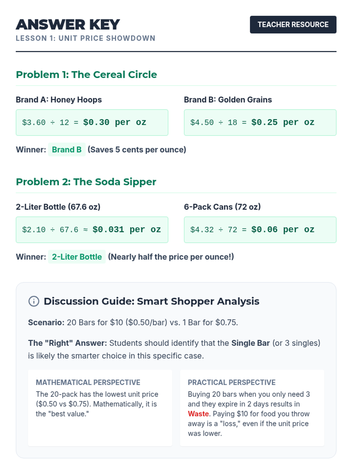 This financial literacy sequence for 6th-grade students focuses on consumer skills, specifically unit pricing, discount evaluation, brand comparison, and hidden costs. Students apply mathematical strategies to real-world shopping scenarios, culminating in a comprehensive grocery store simulation.