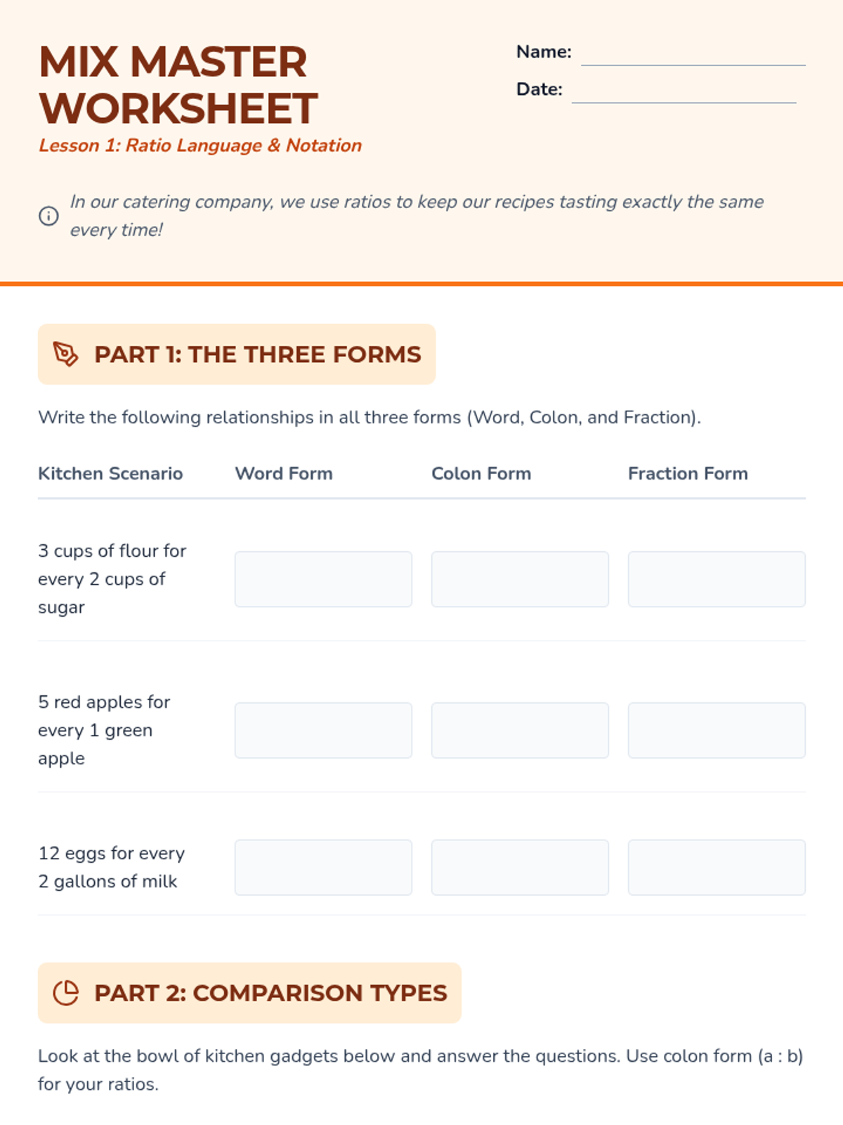 Students launch a mock catering company to explore ratios, equivalent ratios, unit rates, and proportional relationships through the lens of scaling recipes and calculating costs.