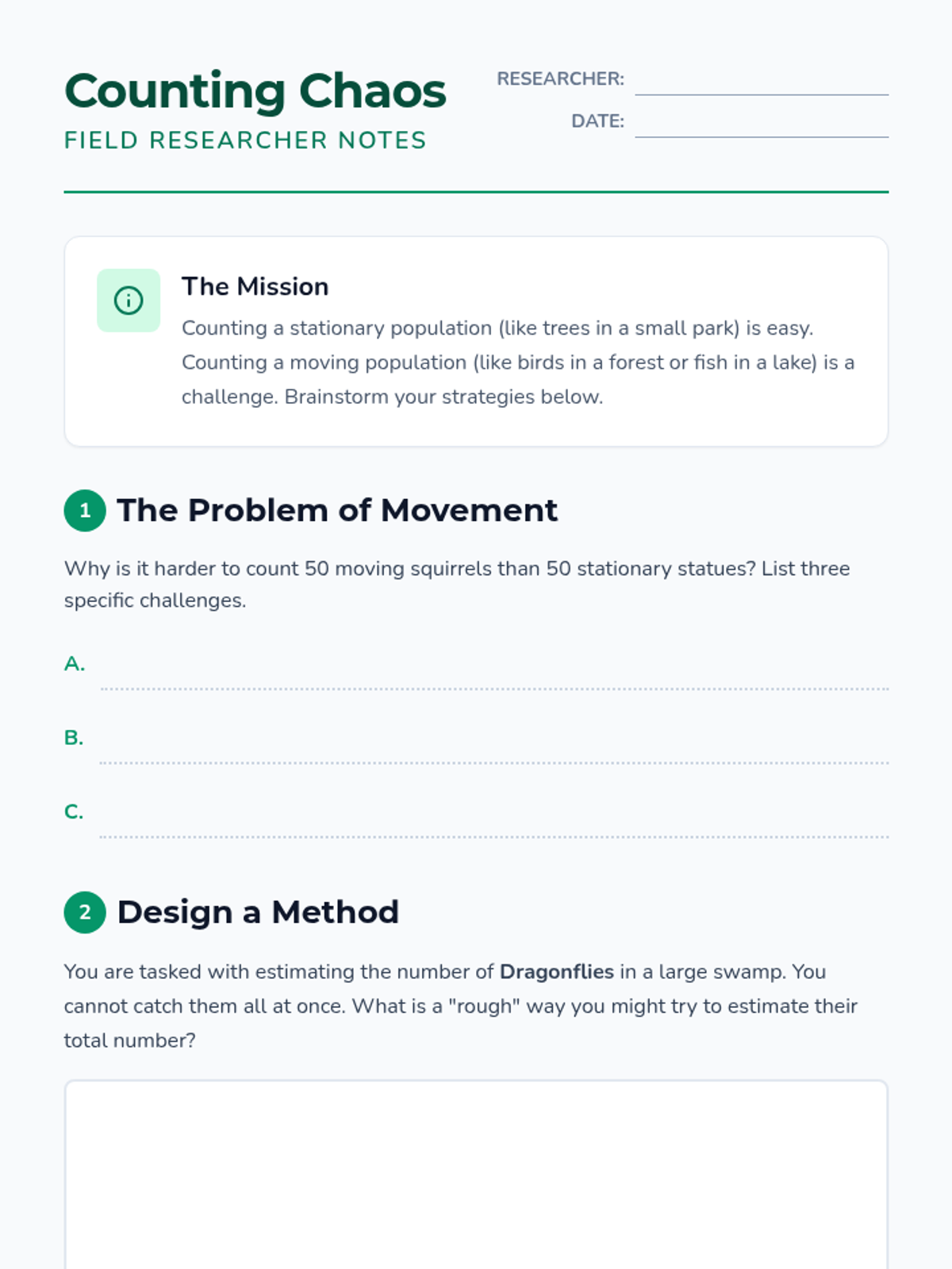 A game-based sequence where students use the Capture-Recapture method to estimate population sizes, progressing from physical simulations to proportional reasoning and real-world ecological analysis.