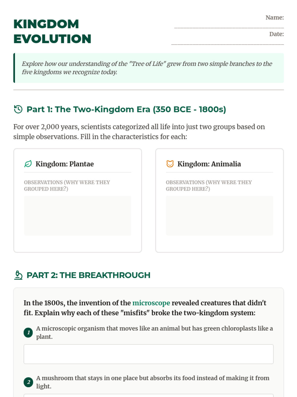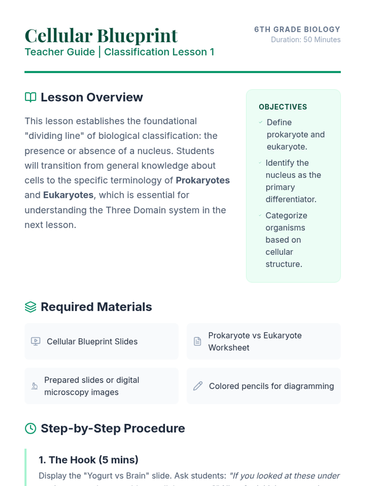 A comprehensive one-week unit covering the foundations of cell theory, the technical mastery of microscopes, and the fascinating structures of unicellular organisms (Amoeba, Paramecium, Euglena, and Volvox).
