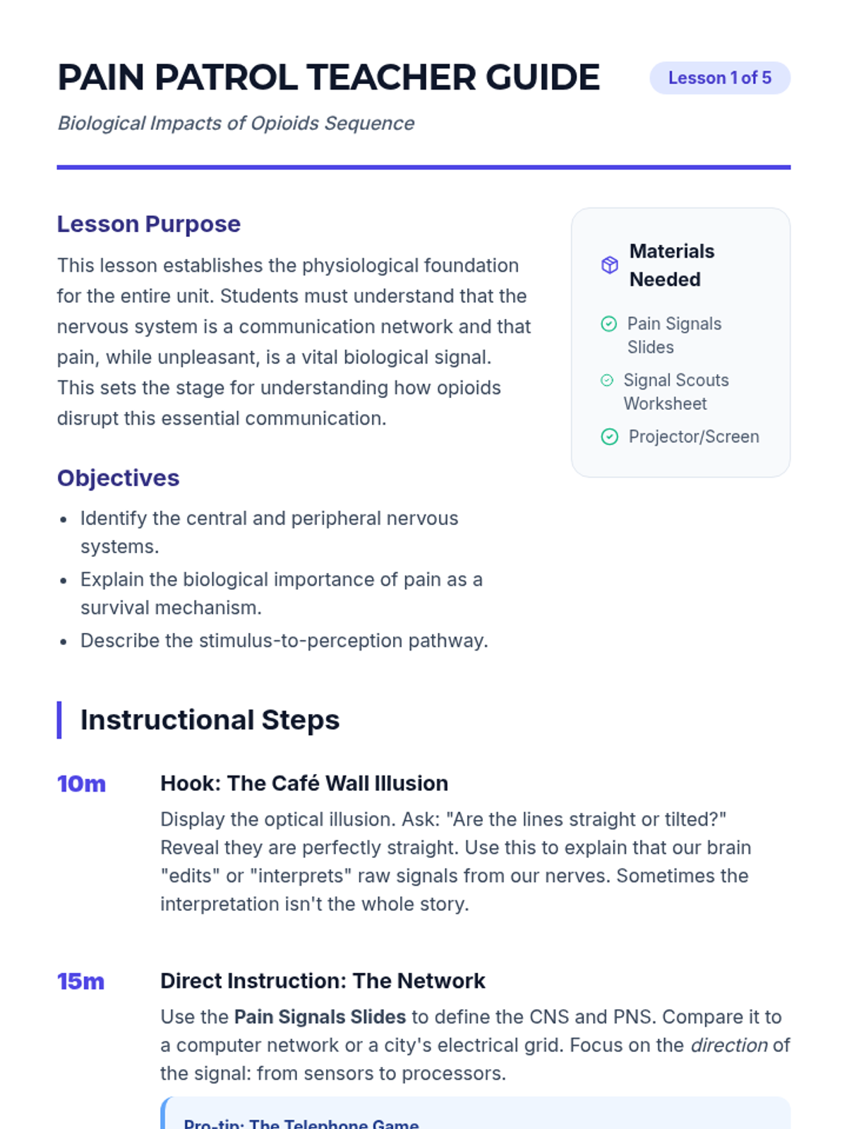 This inquiry-based sequence explores the biological impact of opioids on the nervous system for 6th-grade students. It covers the science of pain signaling, the chemical 'lock and key' mechanism of receptors, the dopamine reward system, and the physiological cycle of tolerance and addiction.