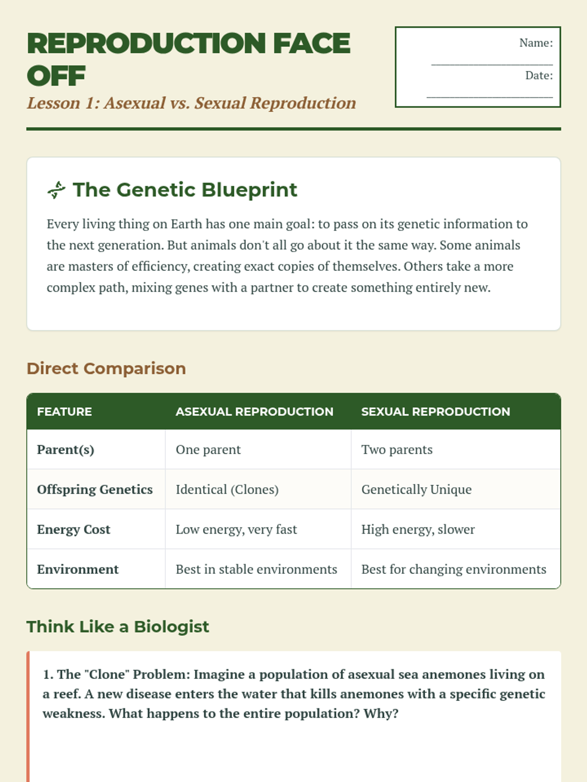 A foundational biology sequence covering reproduction, cell classification, and organism traits for middle school science.