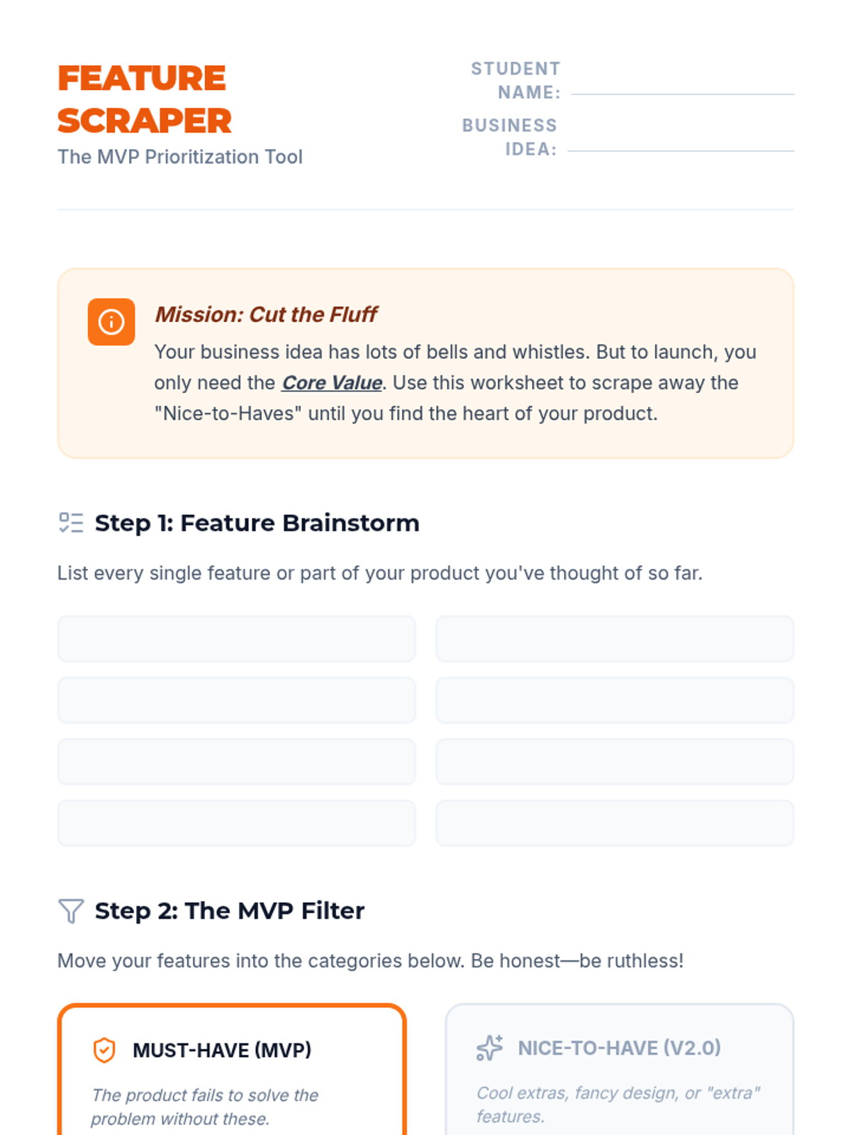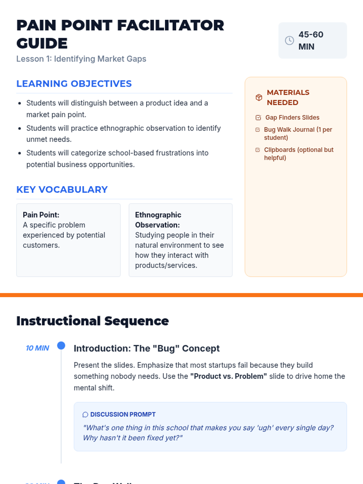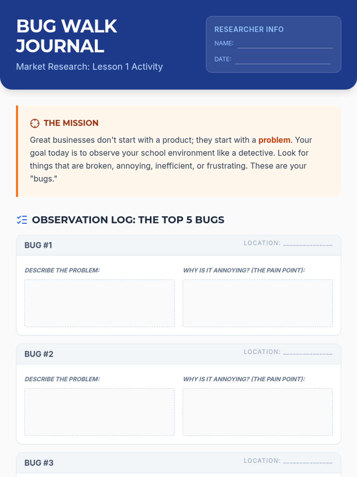Students step into the role of market researchers to validate business ideas using inquiry-driven methods. They progress from identifying community pain points and creating customer personas to designing unbiased surveys and conducting competitive analysis. The sequence culminates in a Market Viability Report where students use data to determine if a business idea is worth pursuing.