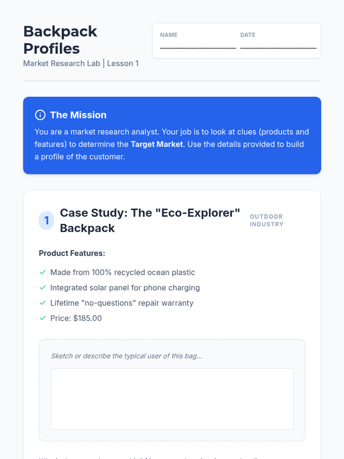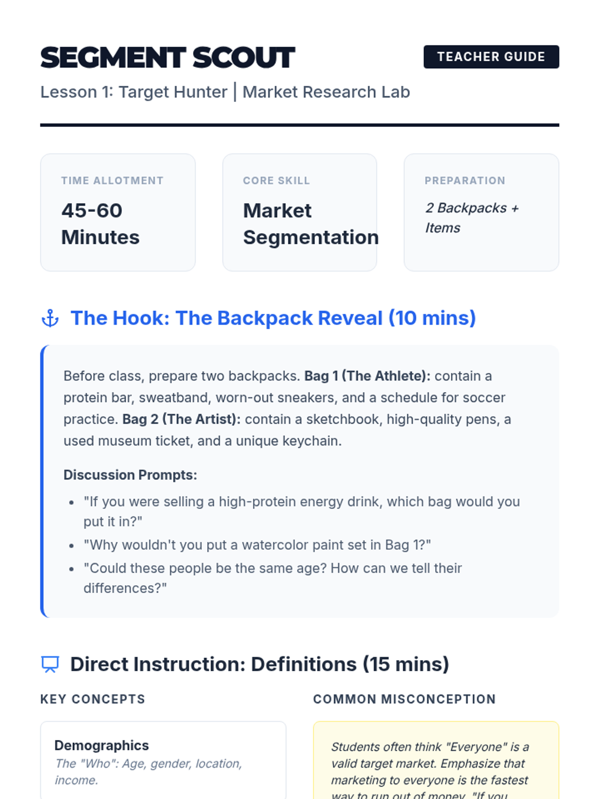 A comprehensive sequence for 6th-grade students focusing on market research and customer analysis to validate business ideas. Students transition from understanding broad markets to creating specific user personas based on data gathered through surveys and interviews.