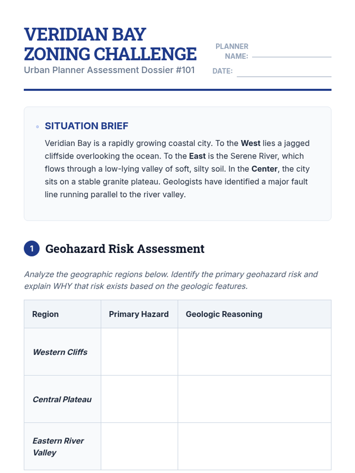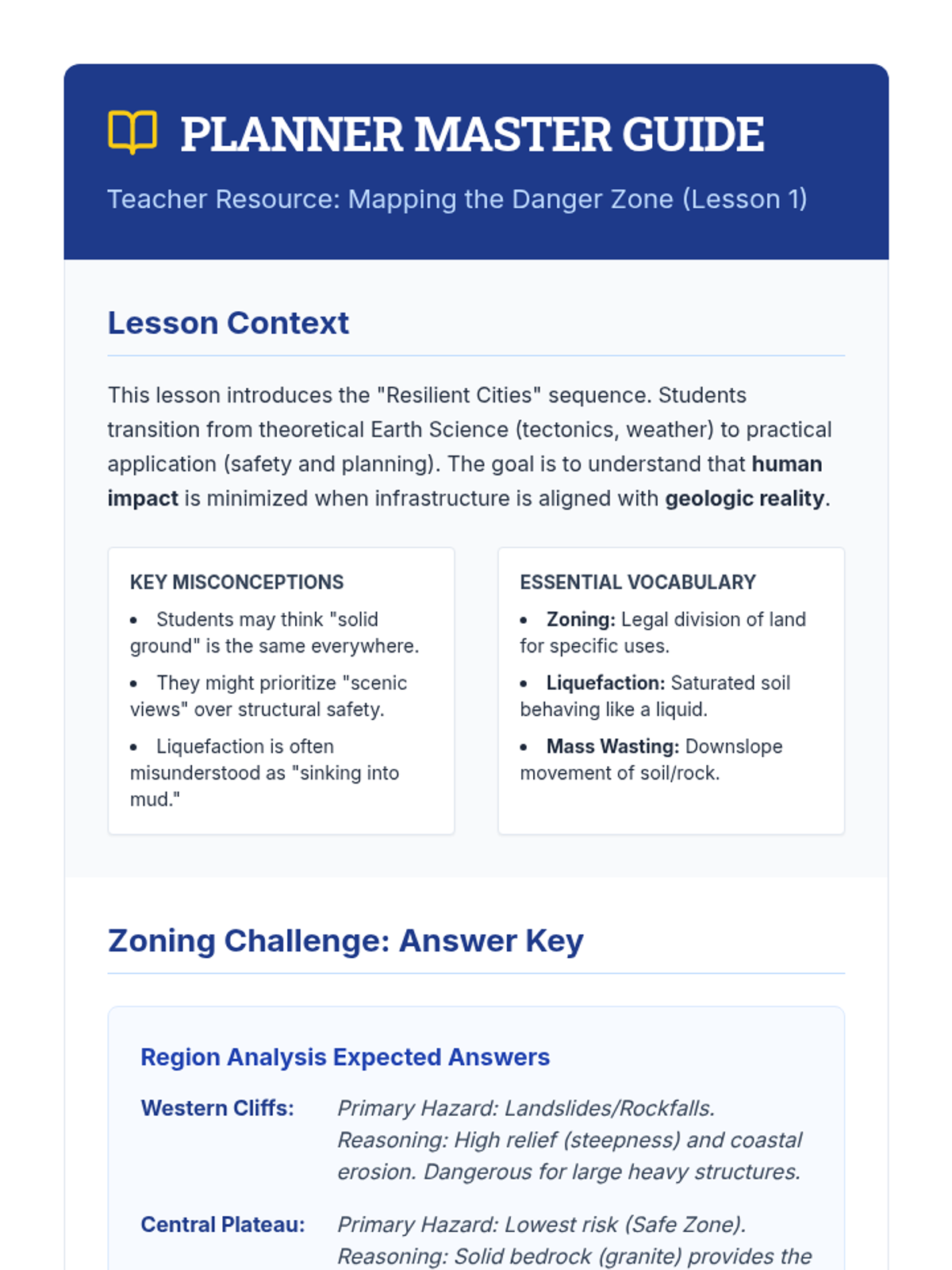 Students act as city planners, using geologic data to assess risks and design mitigation strategies for a fictional region. The unit covers zoning, building codes, and emergency response, culminating in a town hall simulation where students defend their resilience plans.