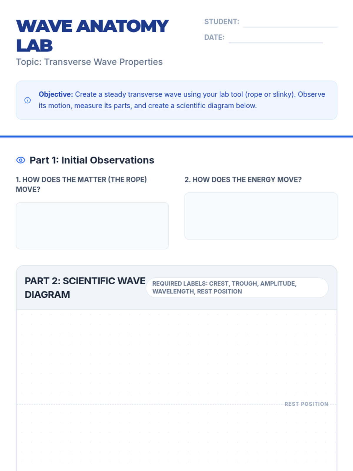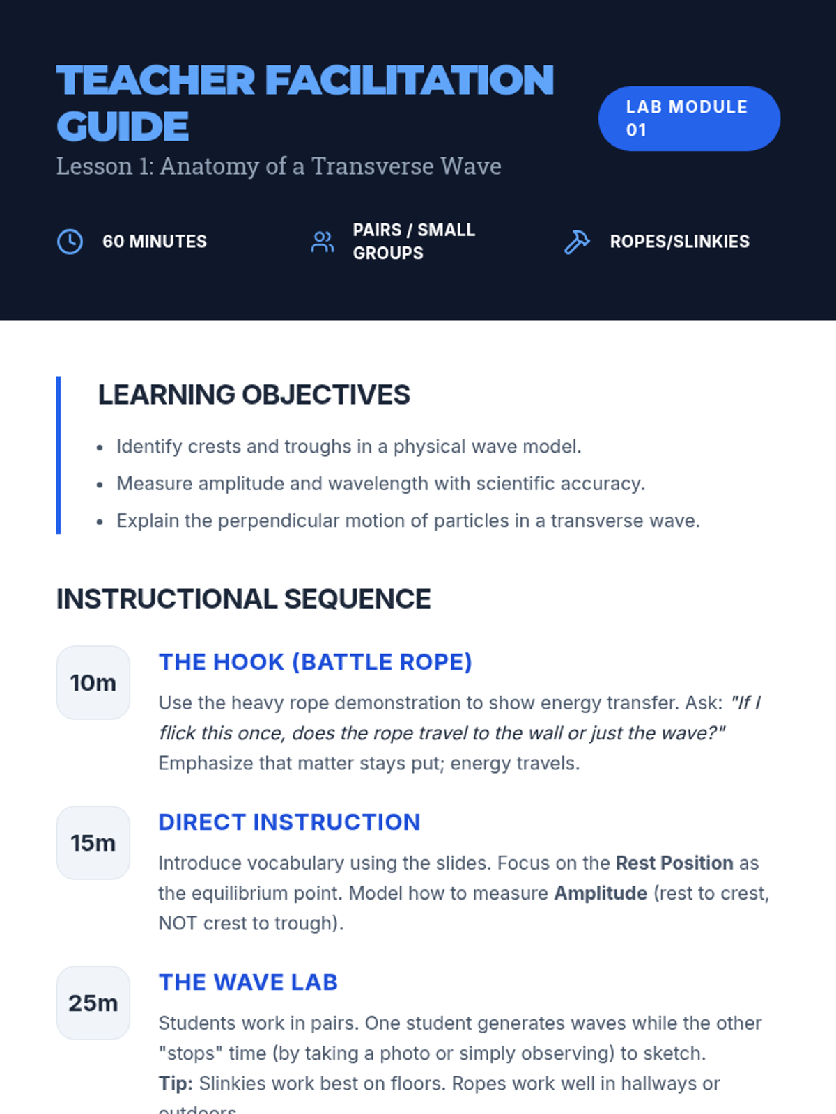 A comprehensive 6th-grade physics sequence exploring the physical properties of electromagnetic waves. Students progress from hands-on modeling of transverse waves to analyzing the mathematical relationships between frequency, wavelength, and energy.