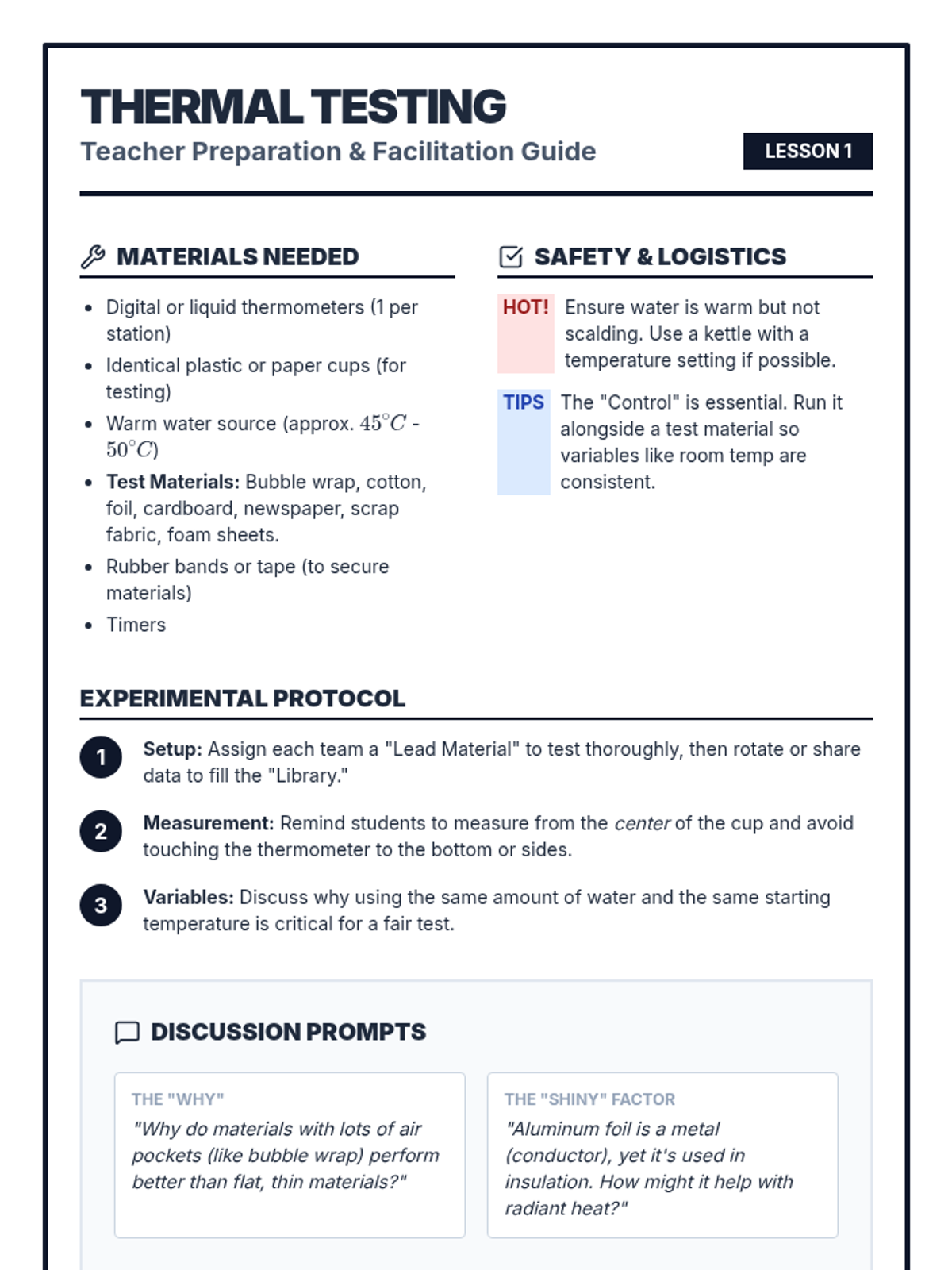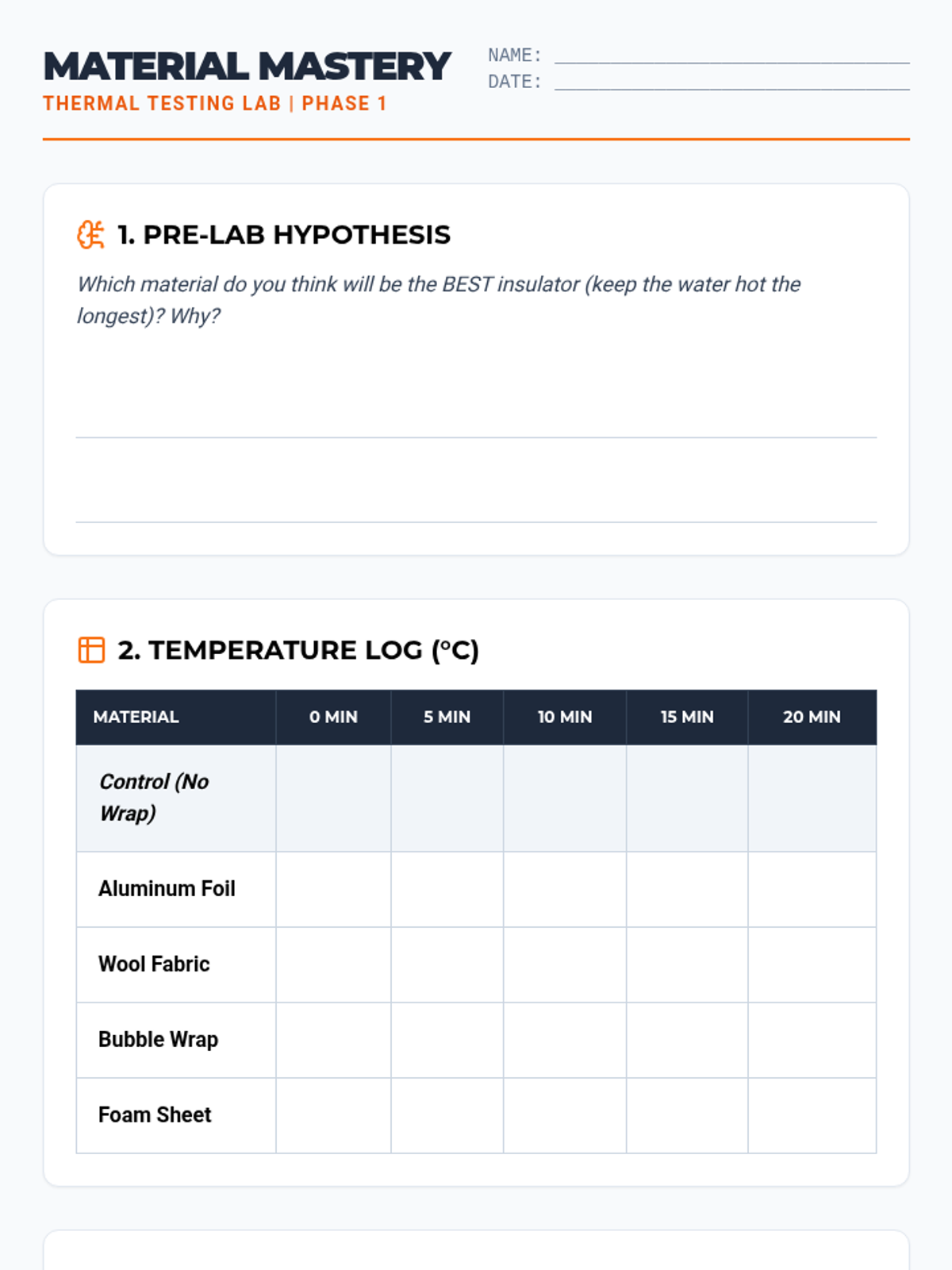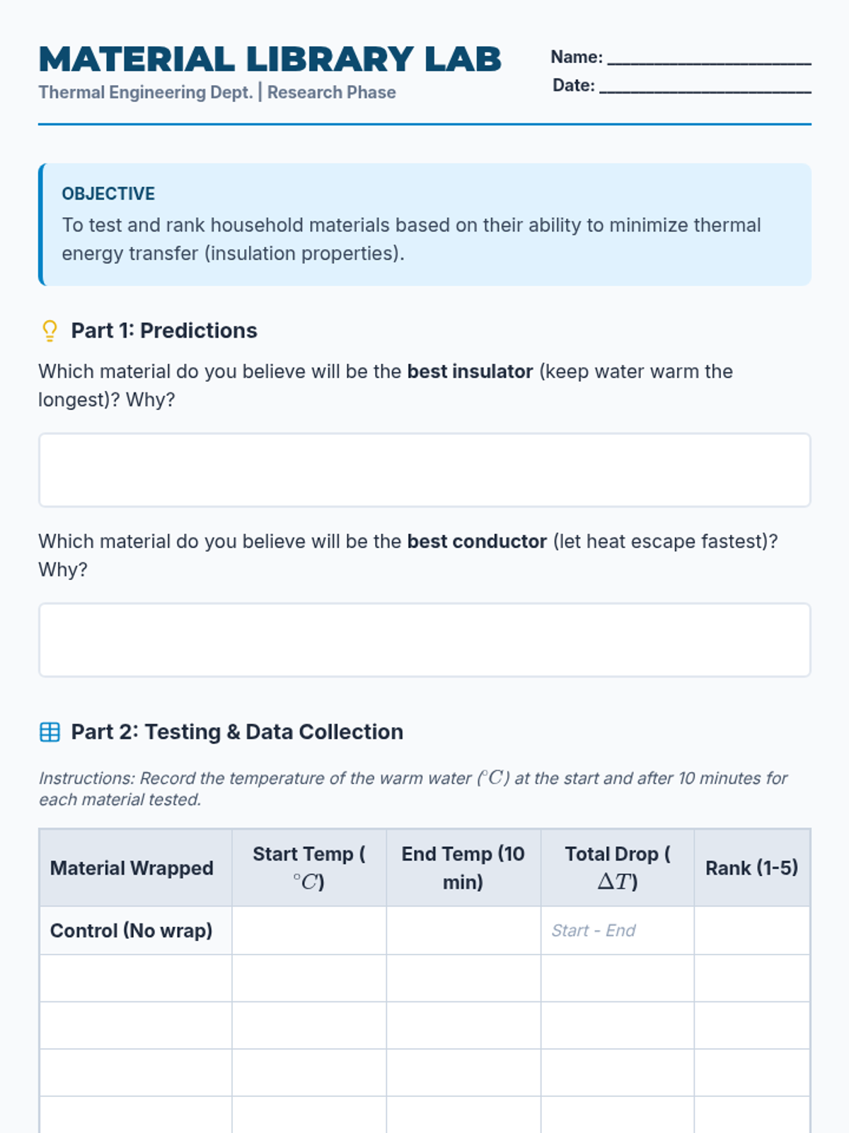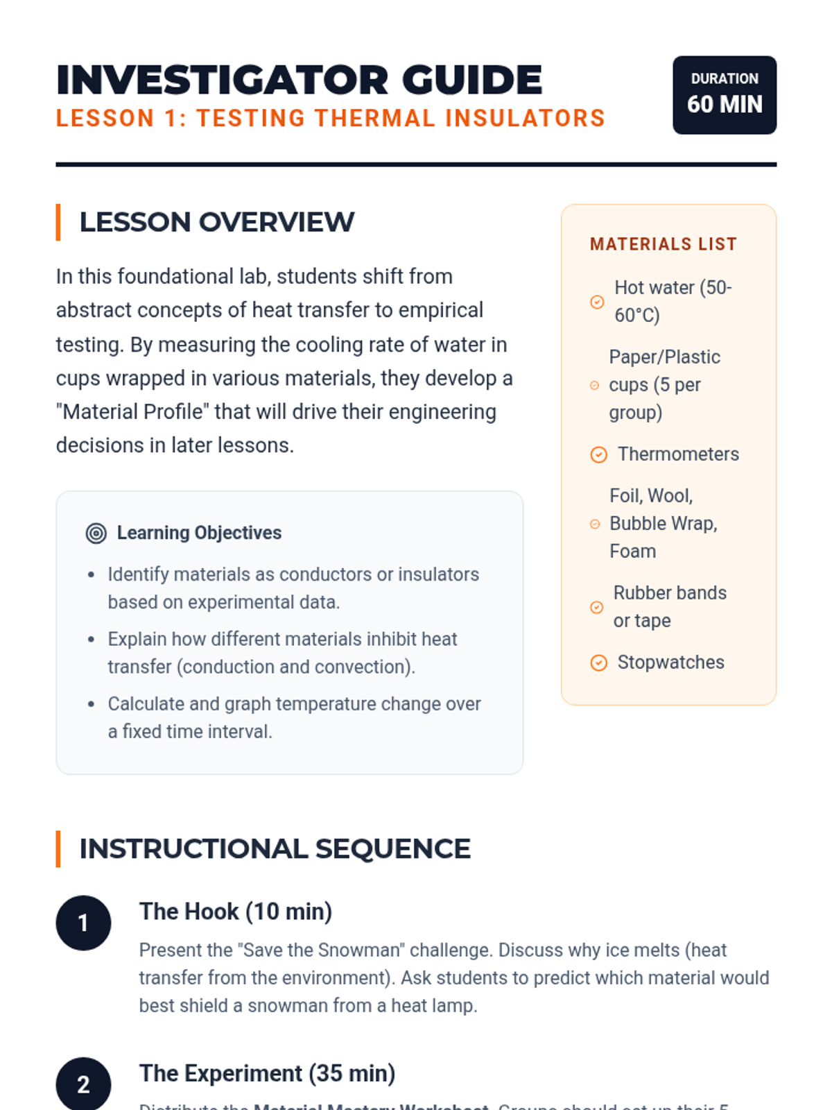 Students explore thermodynamics through an engineering lens, testing materials and iterating on designs to create the ultimate thermal container. The sequence emphasizes data-driven decision making and the engineering design cycle.