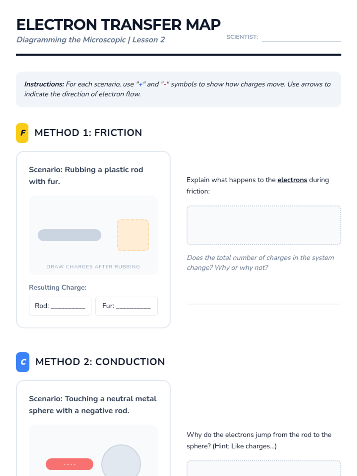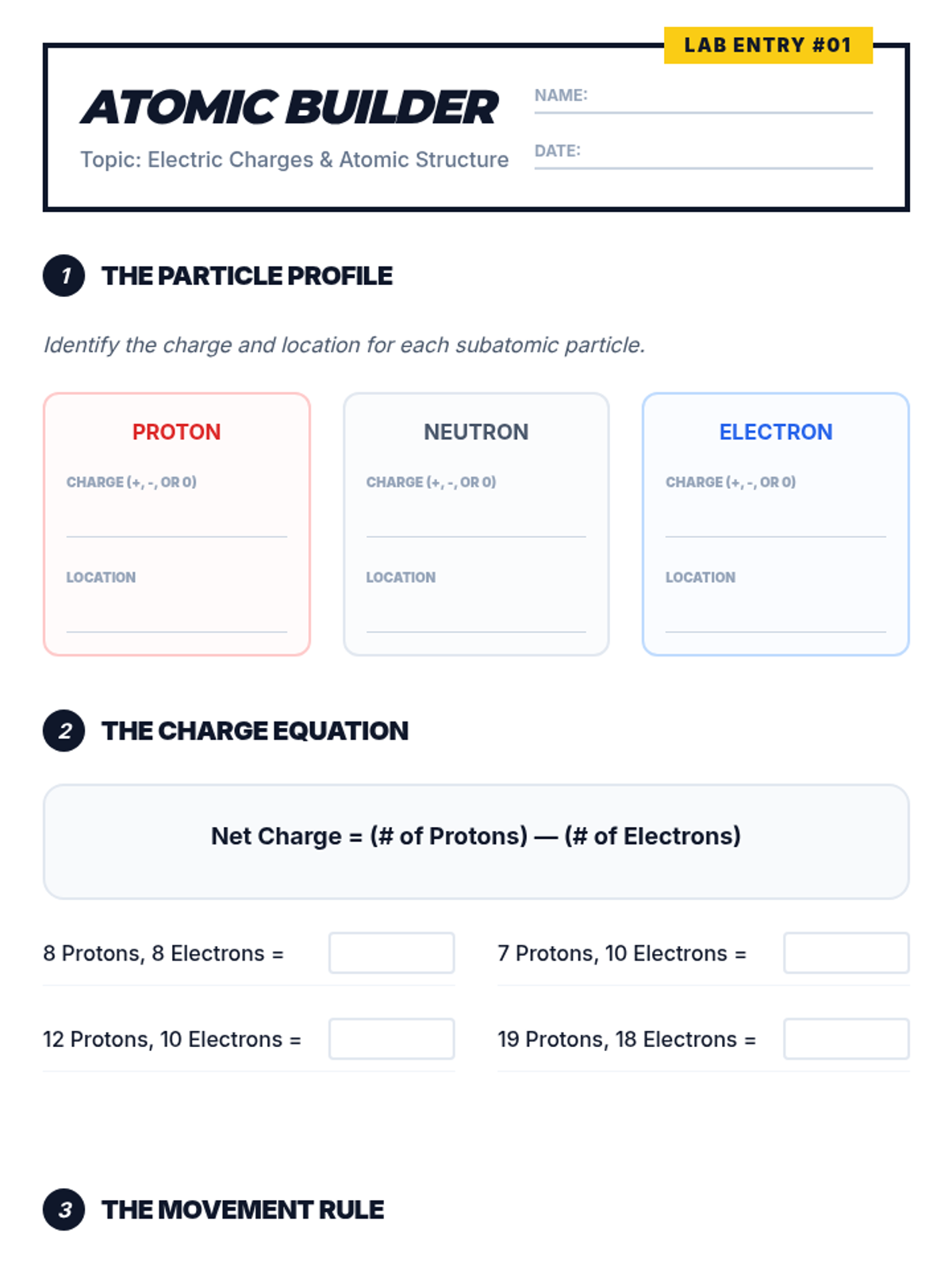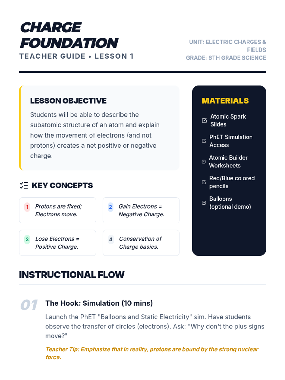 A comprehensive 5-lesson sequence exploring the fundamentals of electric charges, atomic structure, electrostatic forces, electric fields, and real-world static discharge. Students will use hands-on inquiry, simulations, and diagramming to understand how invisible forces govern the behavior of matter at the atomic level.