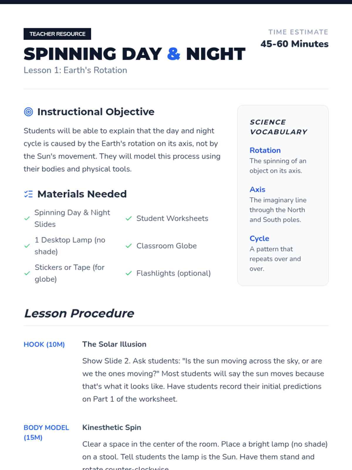 A comprehensive 5-lesson sequence for 6th-grade students to master Earth-Sun-Moon interactions. Students will use spatial reasoning and scientific modeling to explain rotation, revolution, seasons, moon phases, eclipses, and tides through kinesthetic activities, data analysis, and visual synthesis.