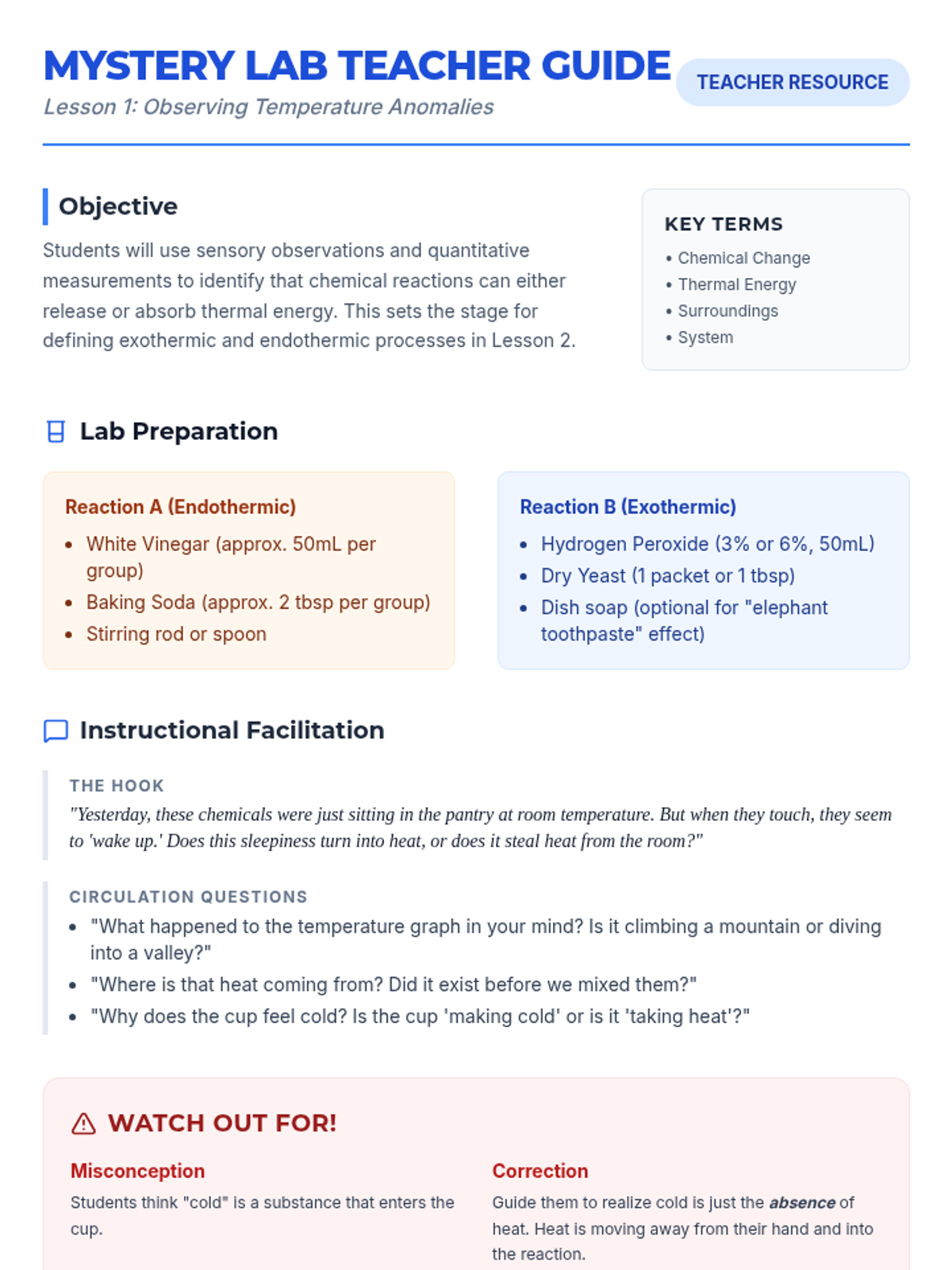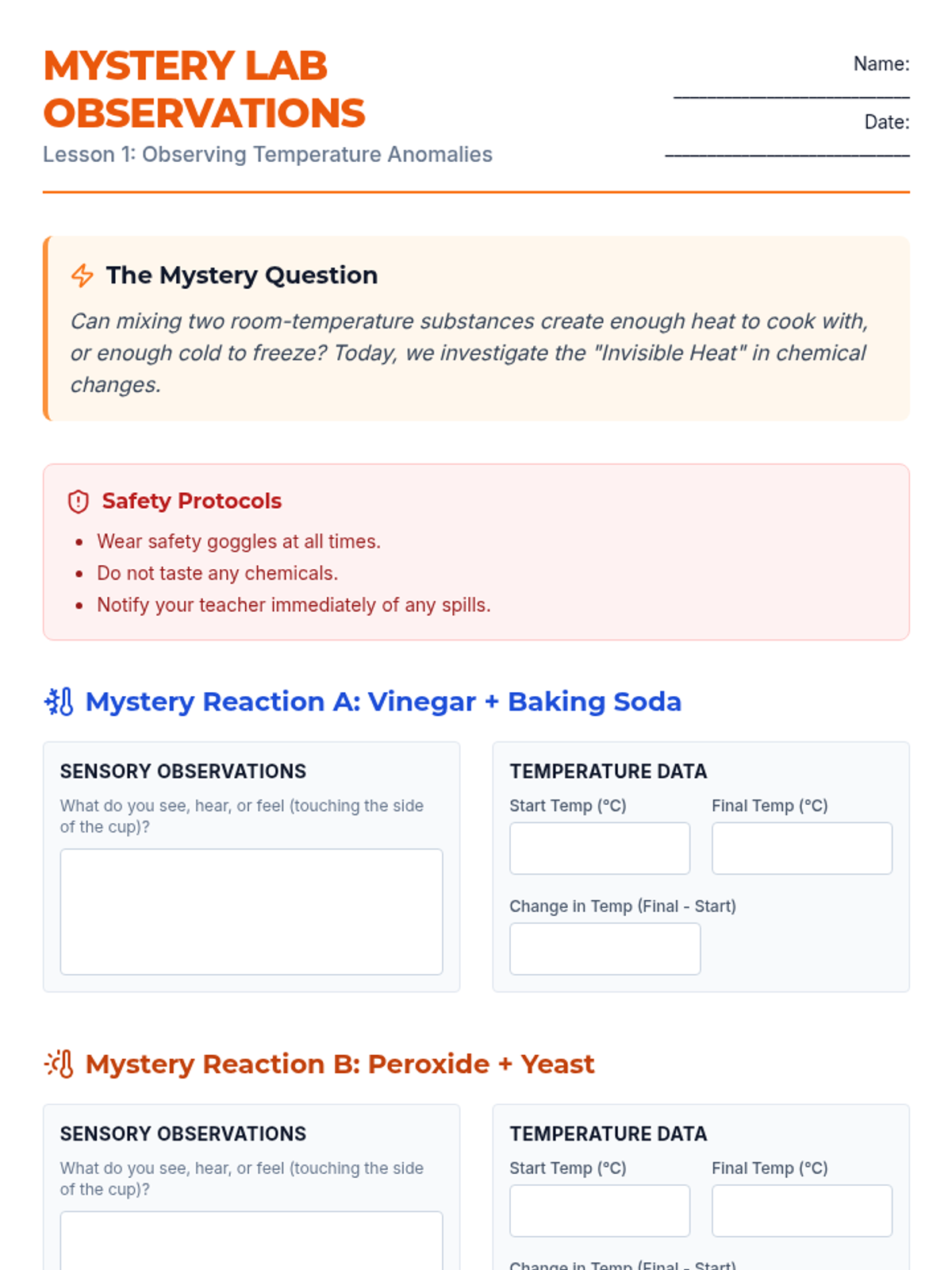 A 5-lesson inquiry-based unit where 6th-grade students investigate temperature changes in chemical reactions, classify them as exothermic or endothermic, and apply their knowledge to real-world technologies.