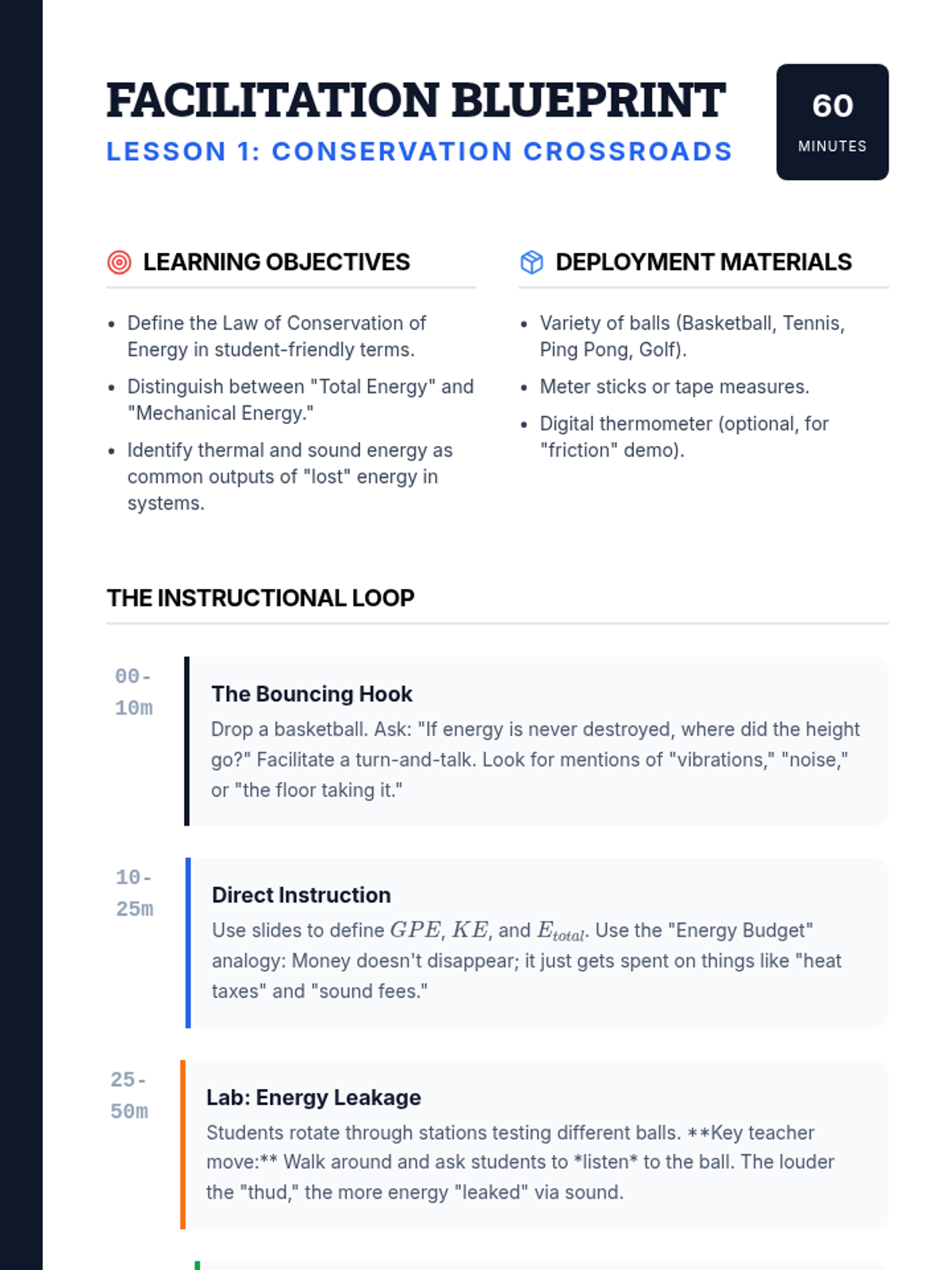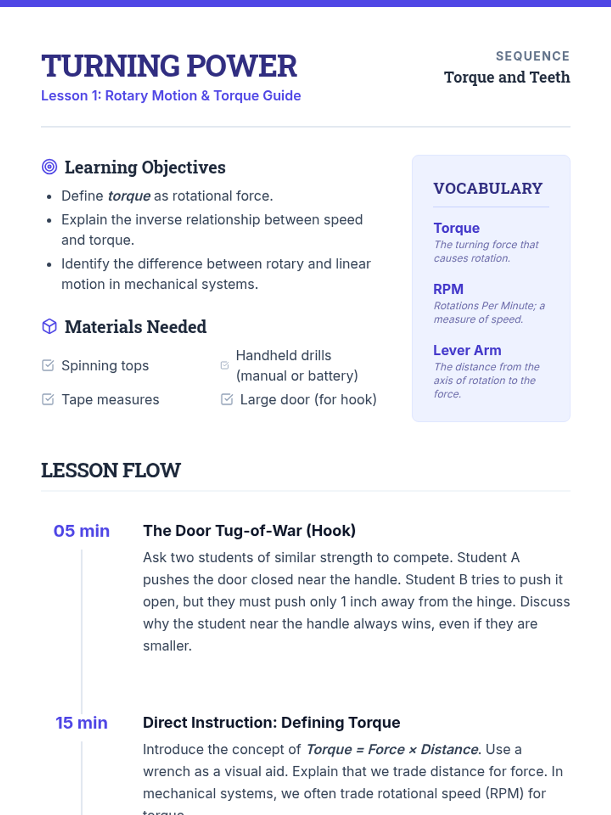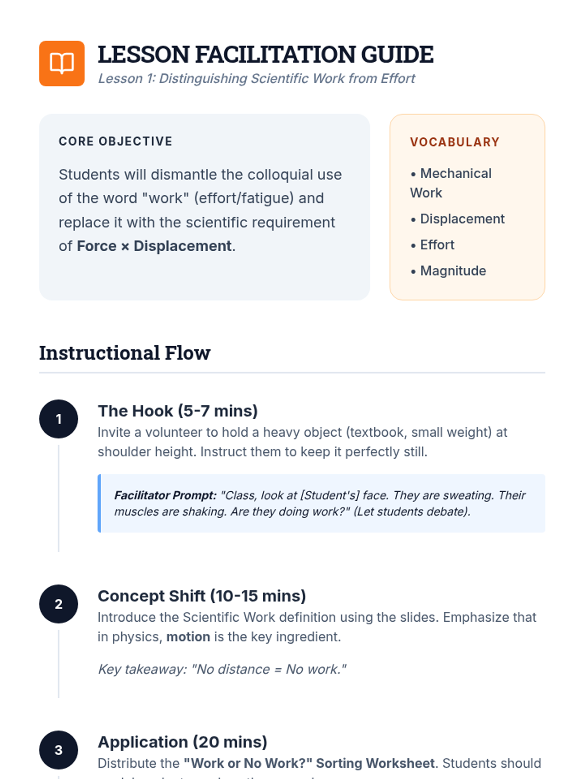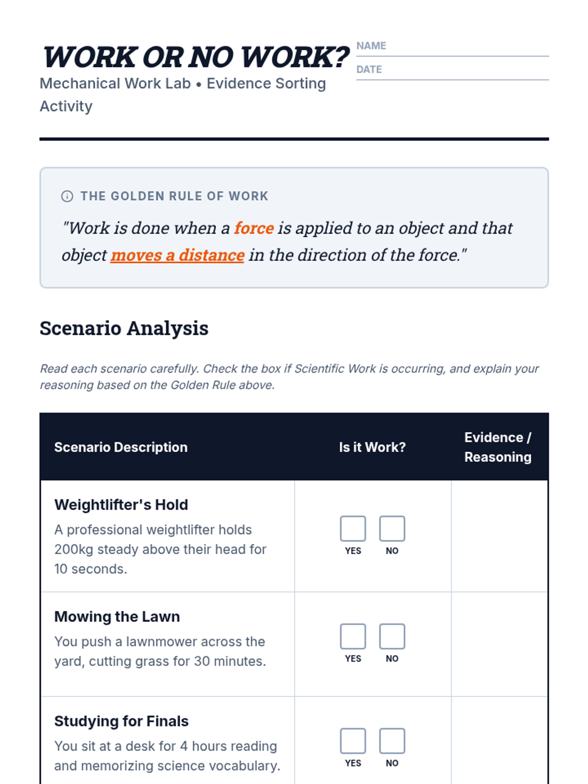 A 5-lesson unit for 6th-grade students defining mechanical work, measuring force and distance, and calculating Joules. Students move from conceptual understanding to hands-on measurement and culminating in a classroom-wide work audit.