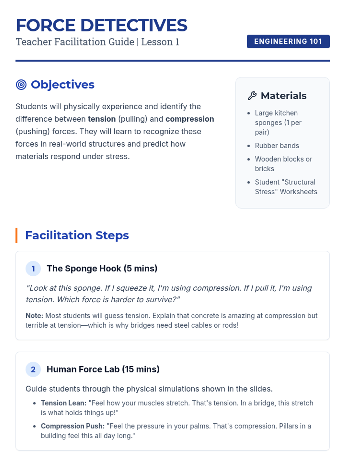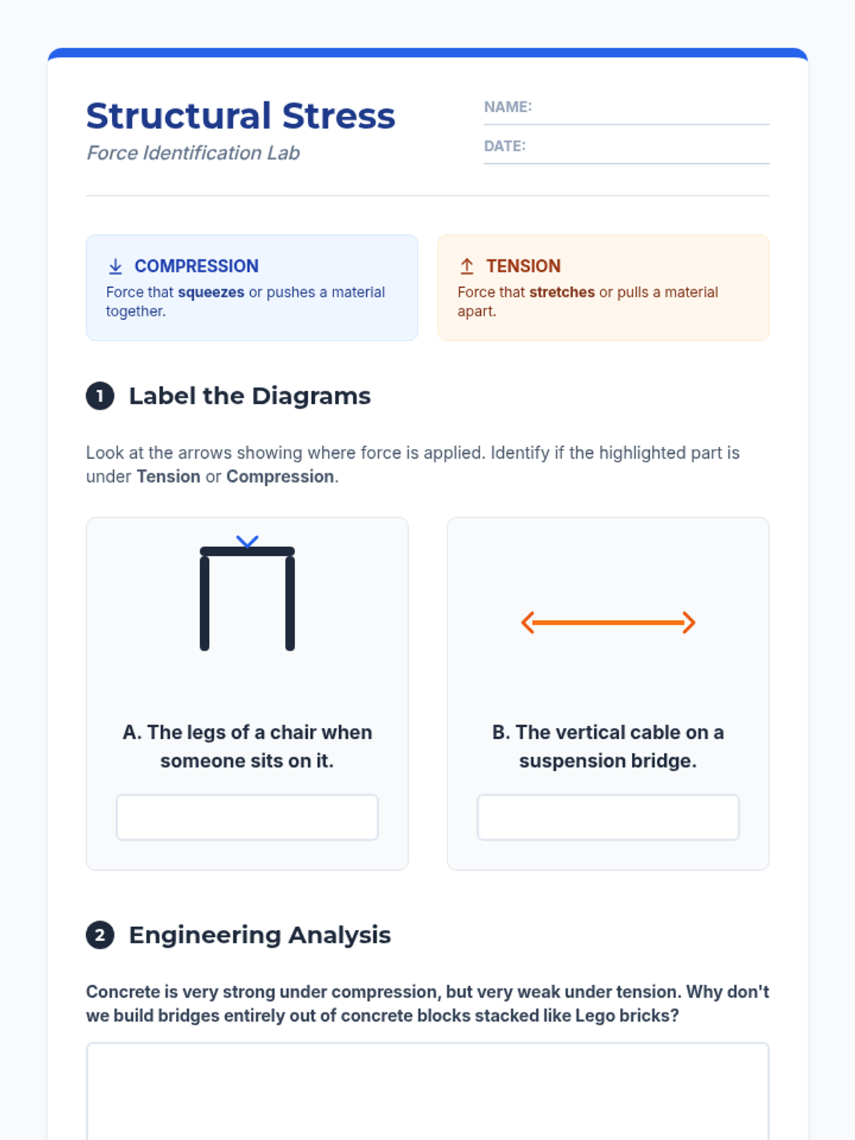 A project-based engineering sequence for 6th graders exploring structural integrity through tension, compression, and truss design. Students progress from feeling basic forces to engineering a weight-bearing structure using geometric stability.