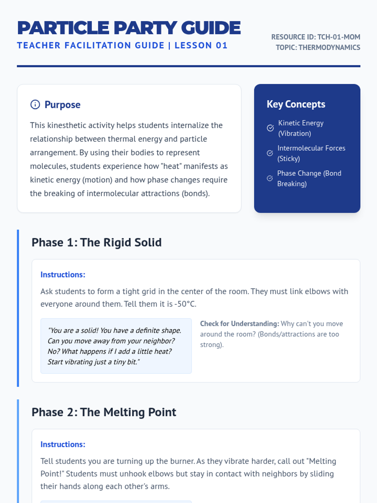 A two-day science unit for 6th graders exploring the relationship between thermal energy, particle motion, and phase changes through visual notes and kinesthetic modeling.
