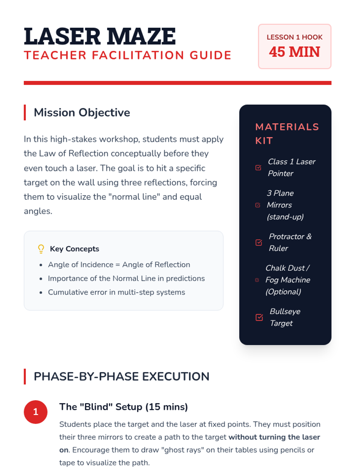 A comprehensive 6th-grade physics sequence exploring the nature of visible light, how it splits into the spectrum, interacts with surfaces through reflection and absorption, and behaves when passing through different mediums.
