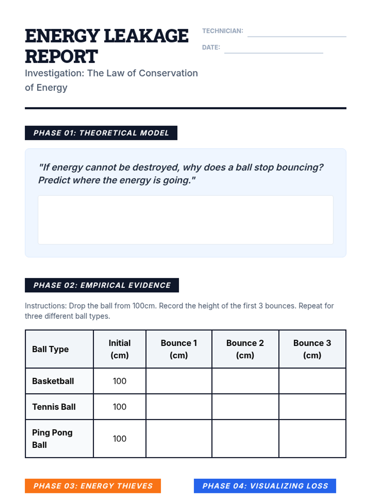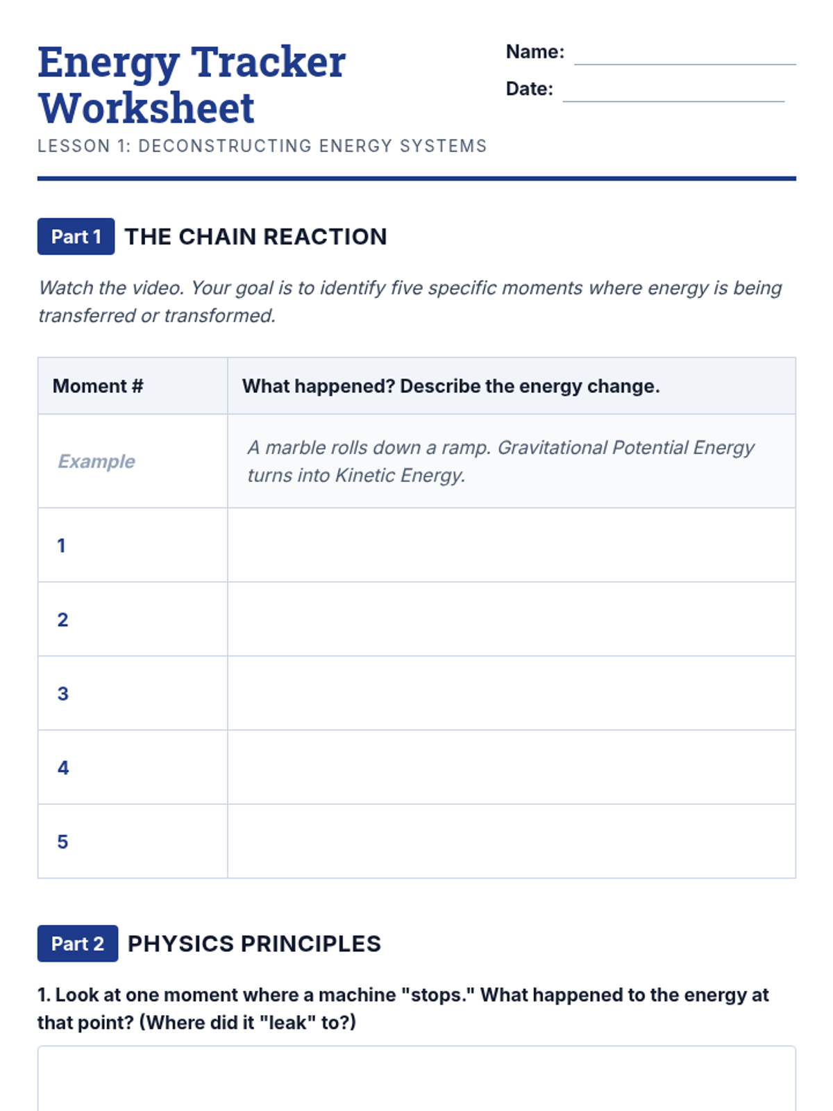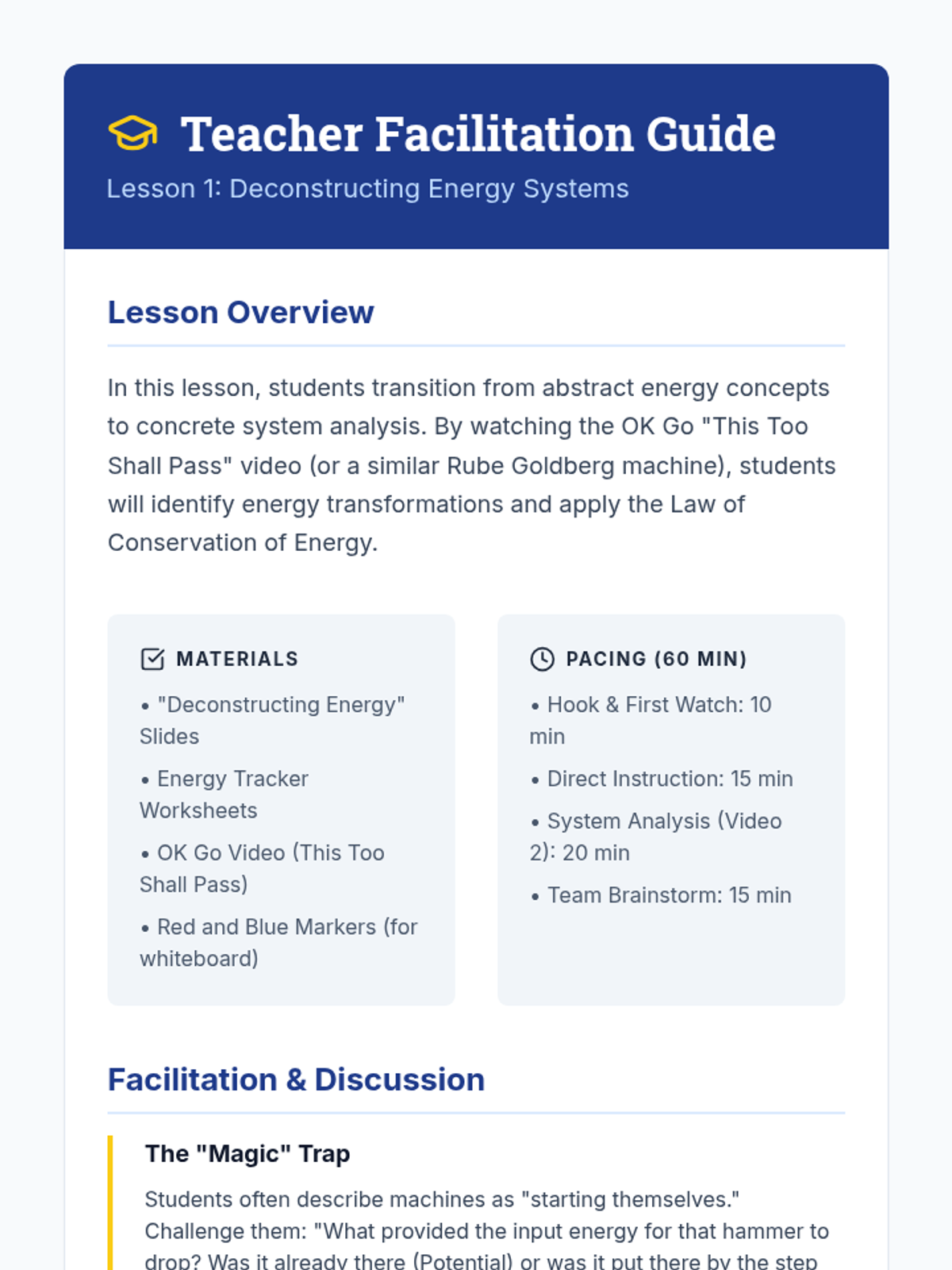 This project-based sequence tasks students with engineering a device that demonstrates multiple energy transformations. Students apply the Law of Conservation of Energy to design Rube Goldberg-style machines, moving from system analysis to blueprinting, prototyping, and final testing.