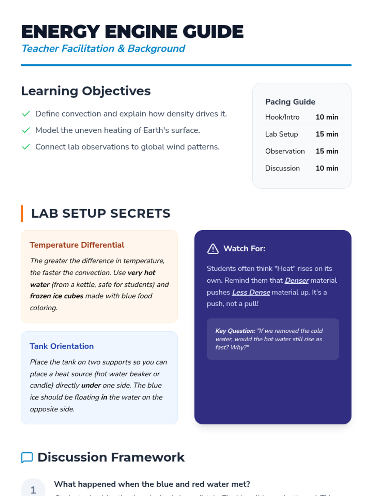 This case-study sequence connects abstract thermodynamic principles to large-scale Earth systems. Students investigate how unequal heating of the Earth drives weather patterns, focusing on specific heat capacities of land versus water and the resulting atmospheric convection.
