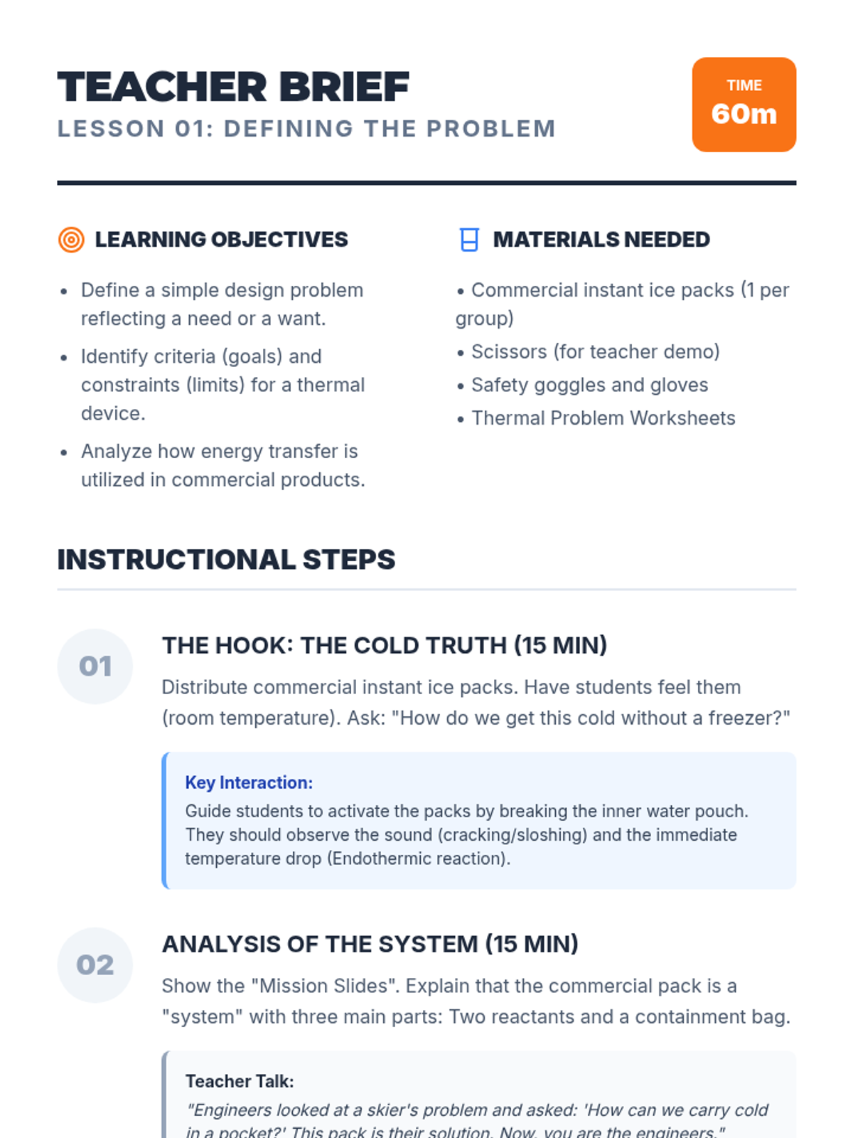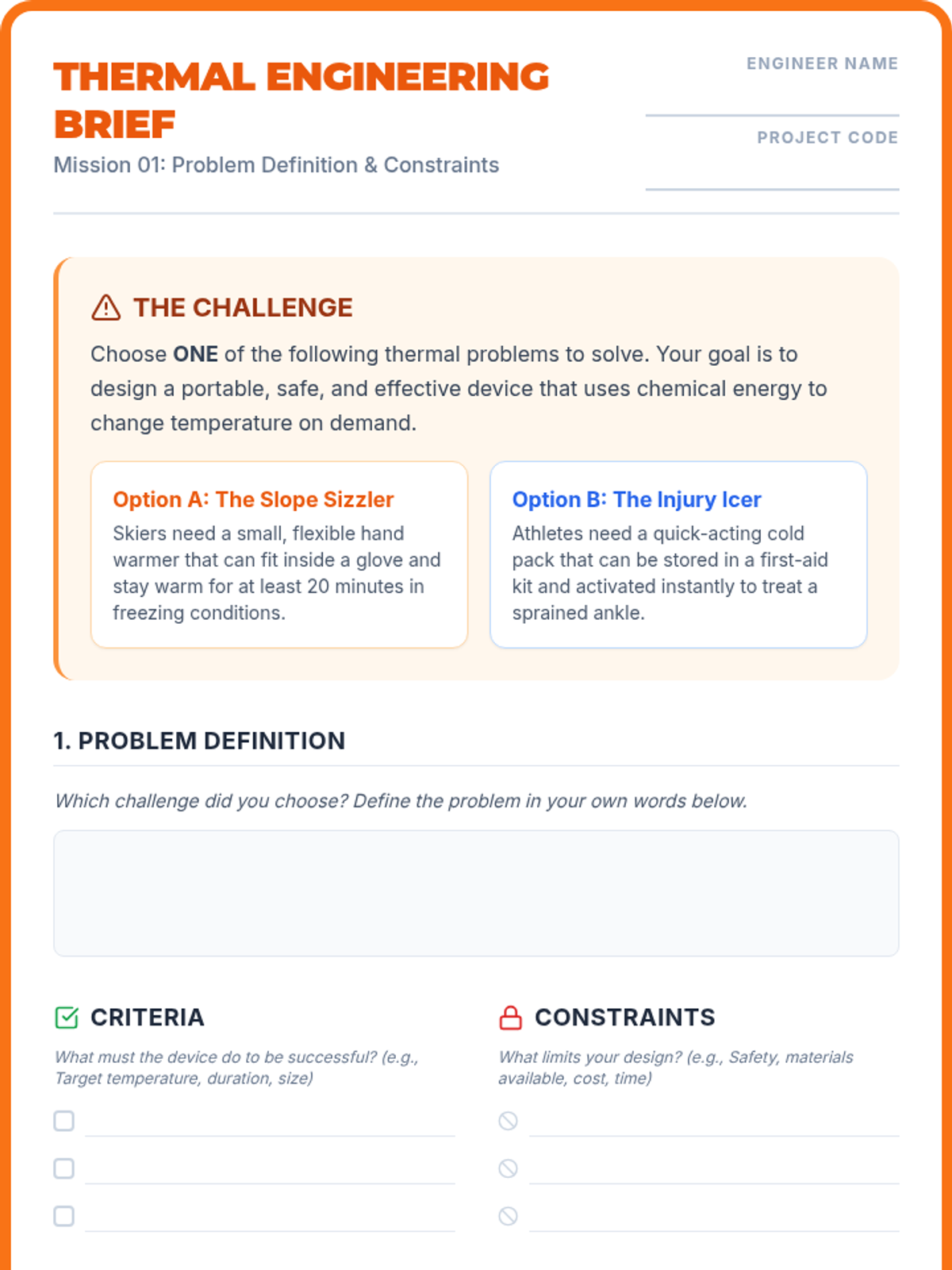 Students take on the role of chemical engineers to design, test, and refine a thermal device (hand warmer or cold pack) using exothermic and endothermic reactions. They navigate the engineering design process from problem definition to final presentation, applying scientific concepts of energy transfer to solve real-world temperature regulation challenges.