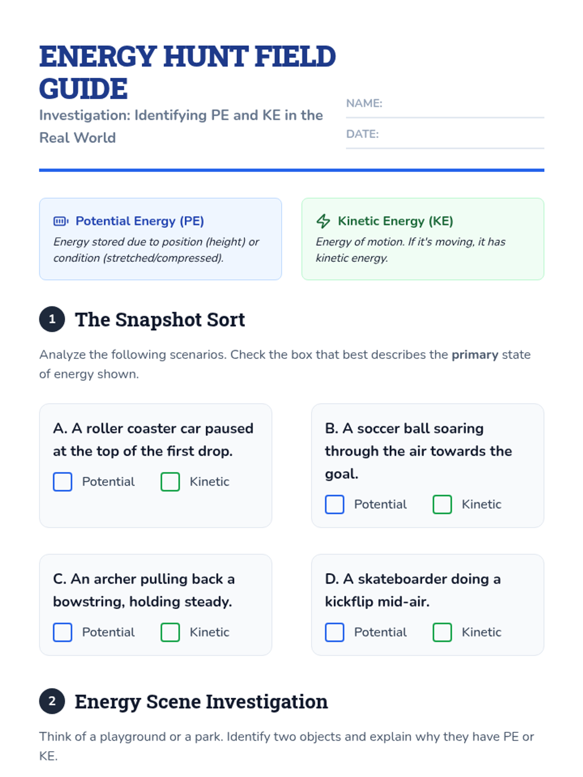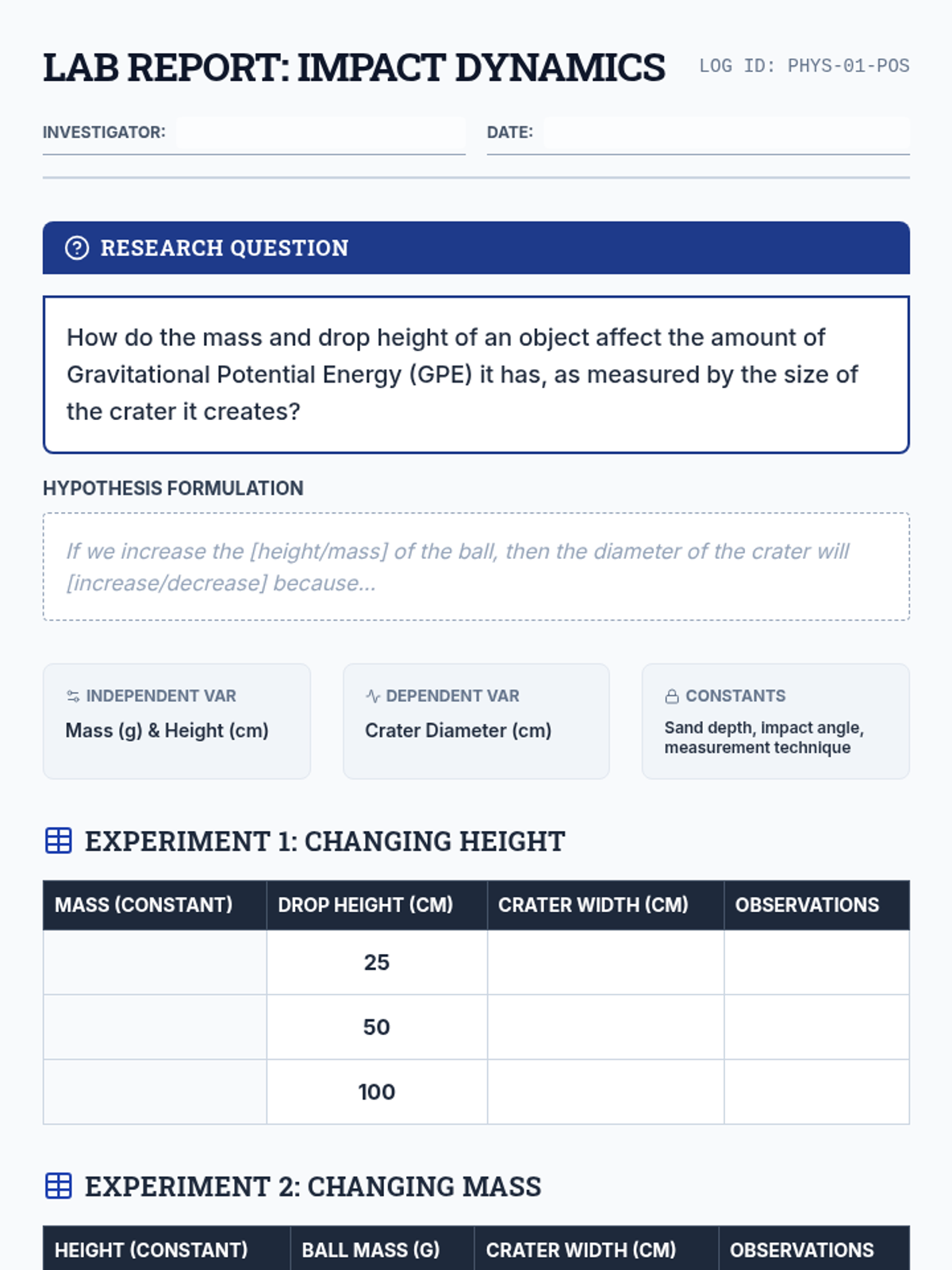 An inquiry-based sequence exploring the variables of mass, height, and velocity and their relationship to Gravitational Potential Energy and Kinetic Energy. Students move from qualitative lab observations to quantitative formula applications.