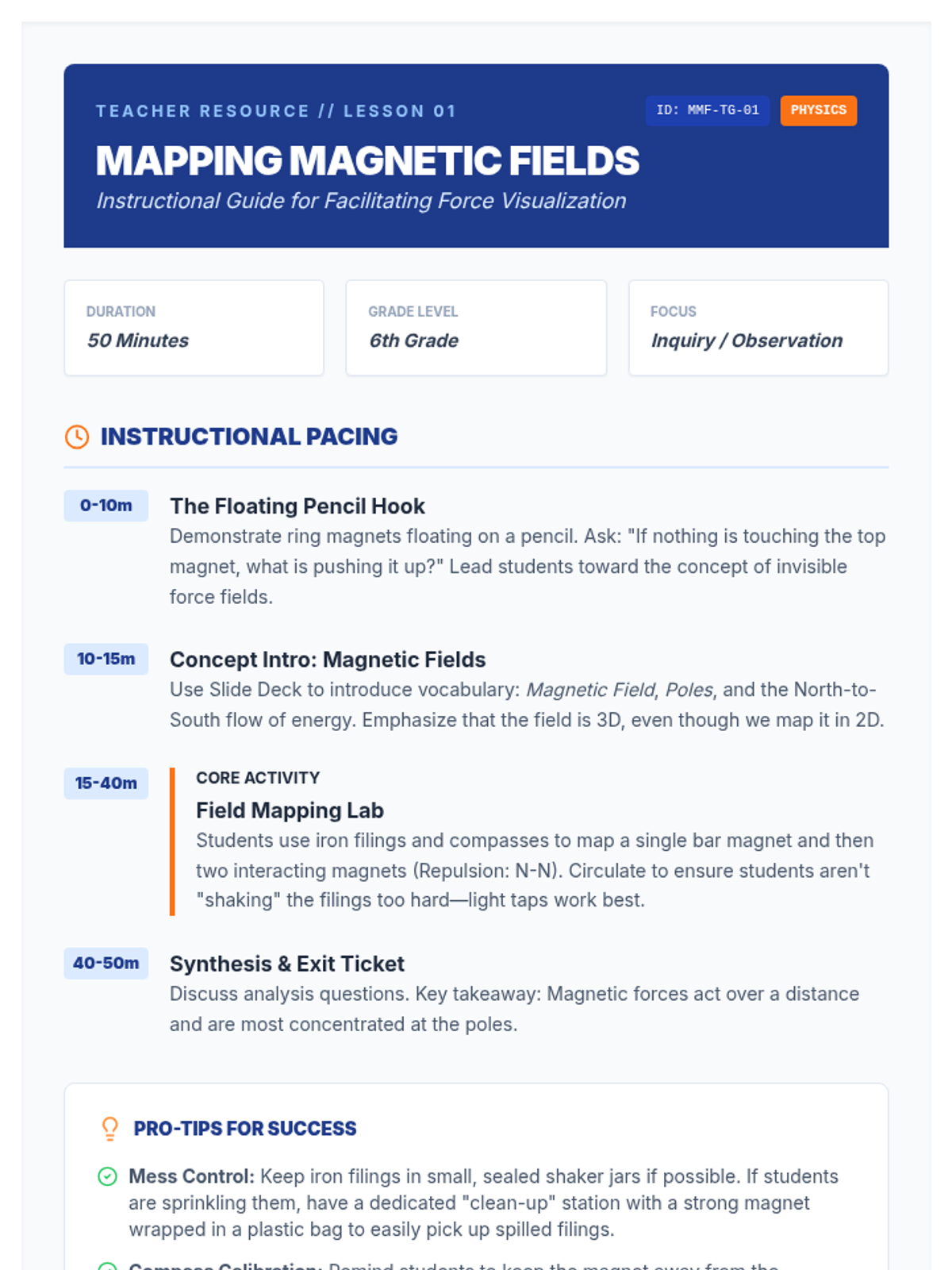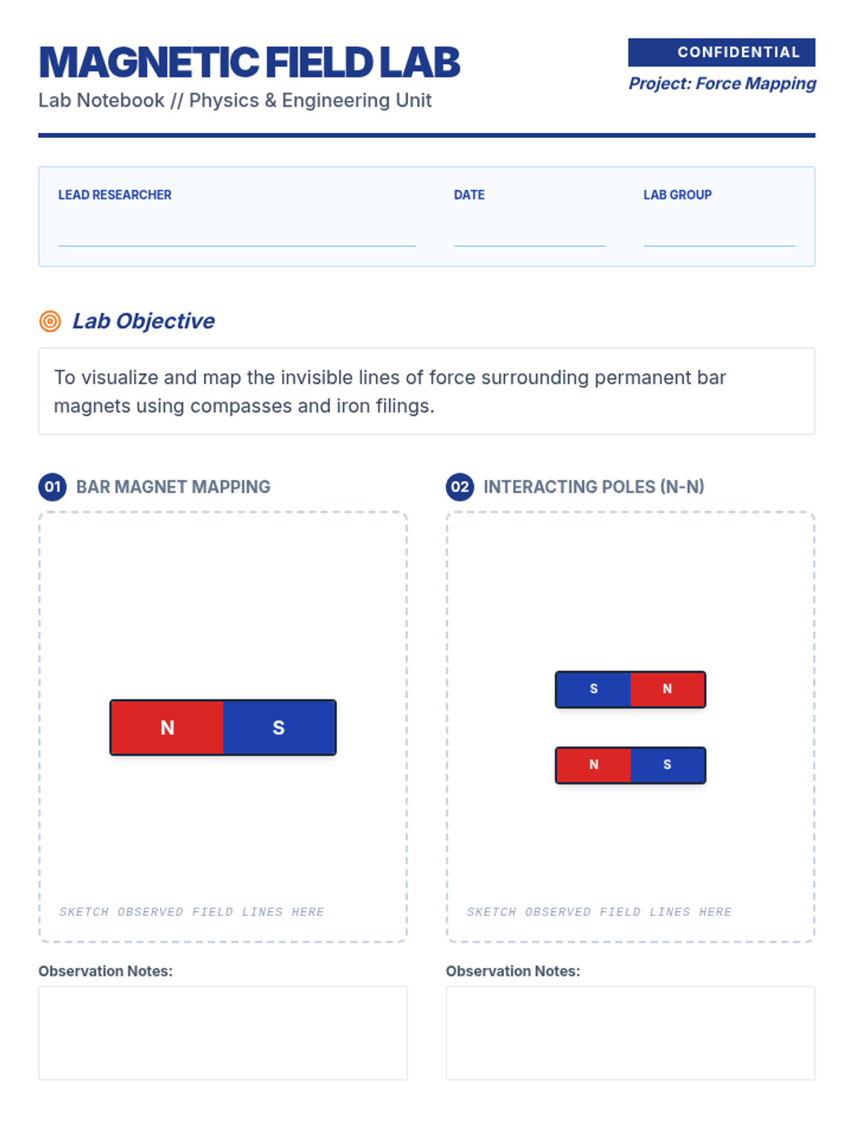 A hands-on exploration of magnetic forces and electromagnetism, from basic pole interactions to engineering solutions using temporary magnets. Students visualize invisible fields and manipulate variables to control magnetic strength.