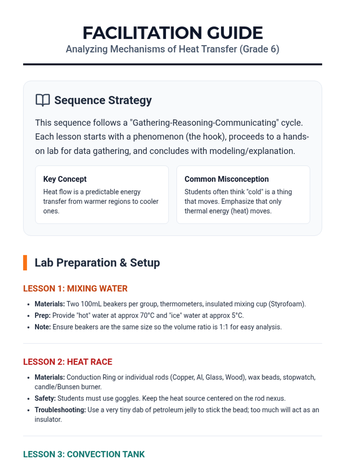 A comprehensive 5-lesson sequence on thermodynamics for 6th grade, focusing on conduction, convection, and radiation. Students explore the direction of heat flow, material properties, and real-world applications through hands-on inquiry and synthesis activities.