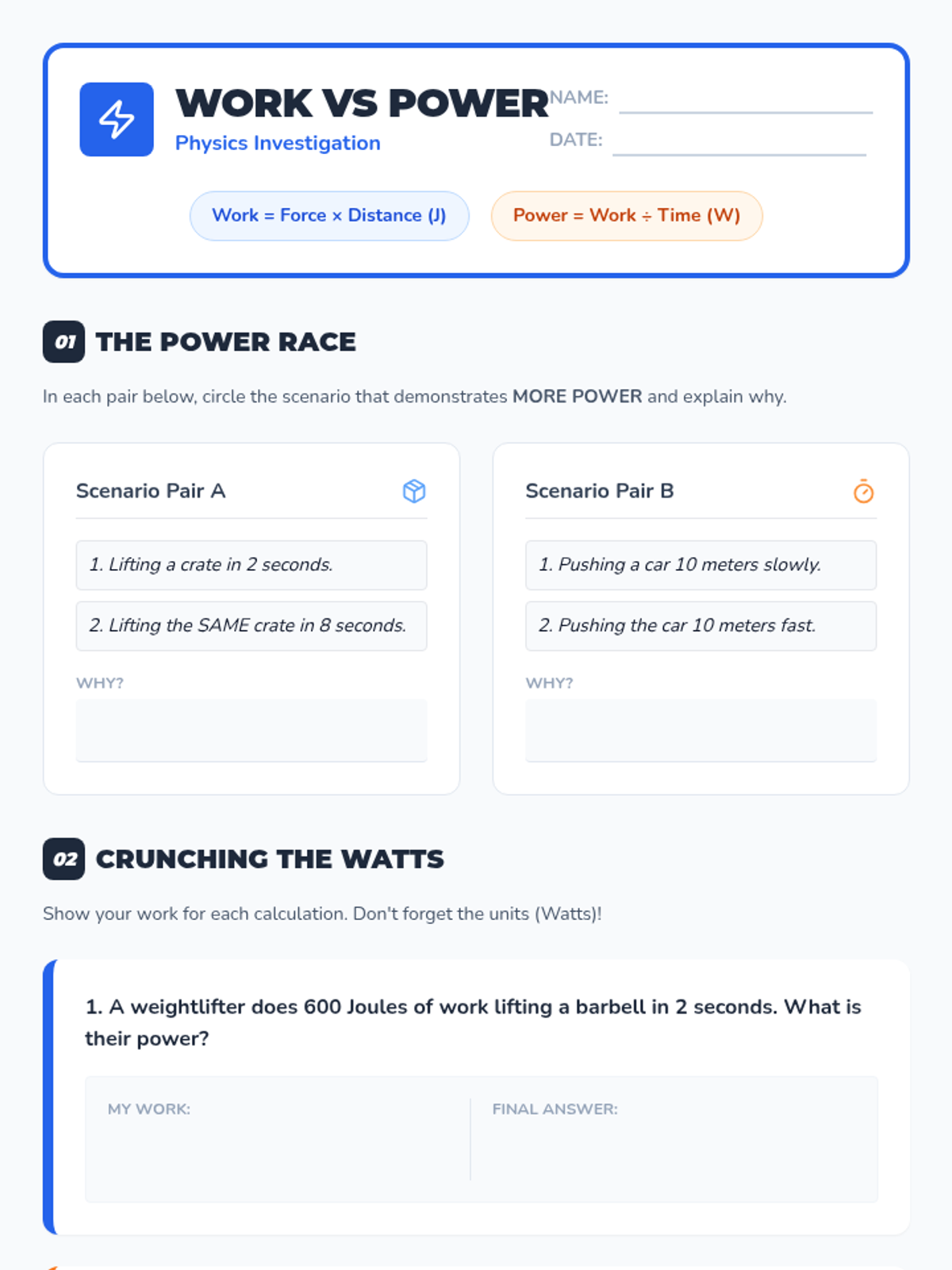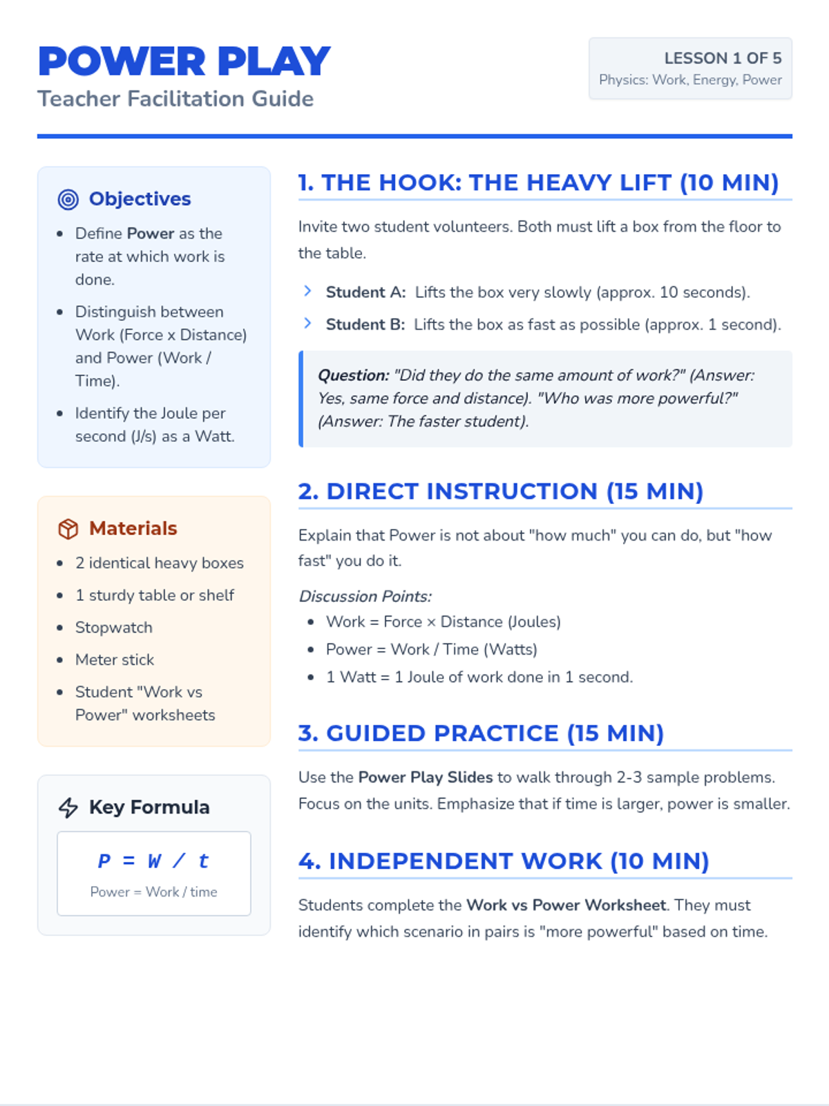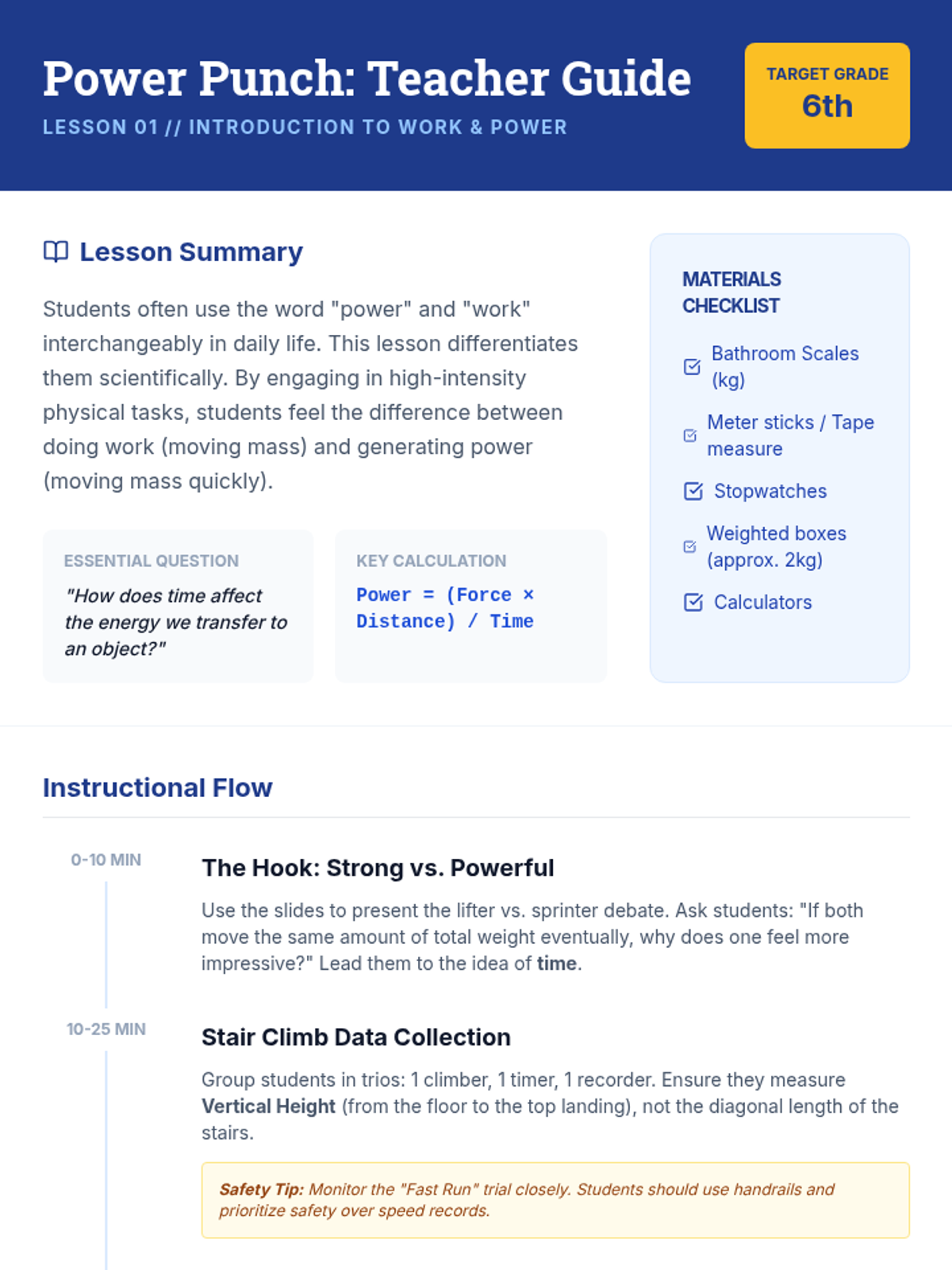 An active, game-based sequence introducing Power as the rate of work. Students transition from understanding 'Work' to calculating 'Power' through physical challenges, unit conversions, and real-world energy comparisons.