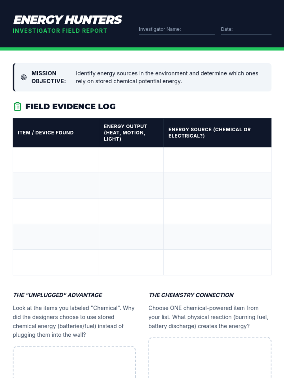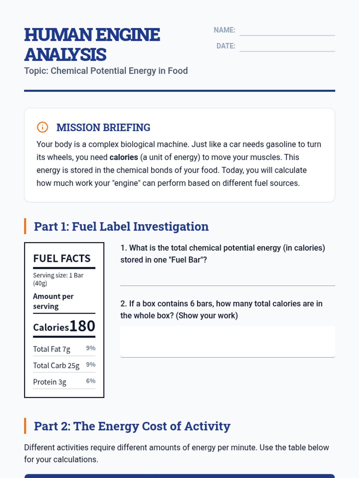 This case study sequence connects abstract chemical energy concepts to real-world biology and industry. Students examine how chemical potential energy is the fuel for modern life and biological function, from car engines to cellular respiration.
