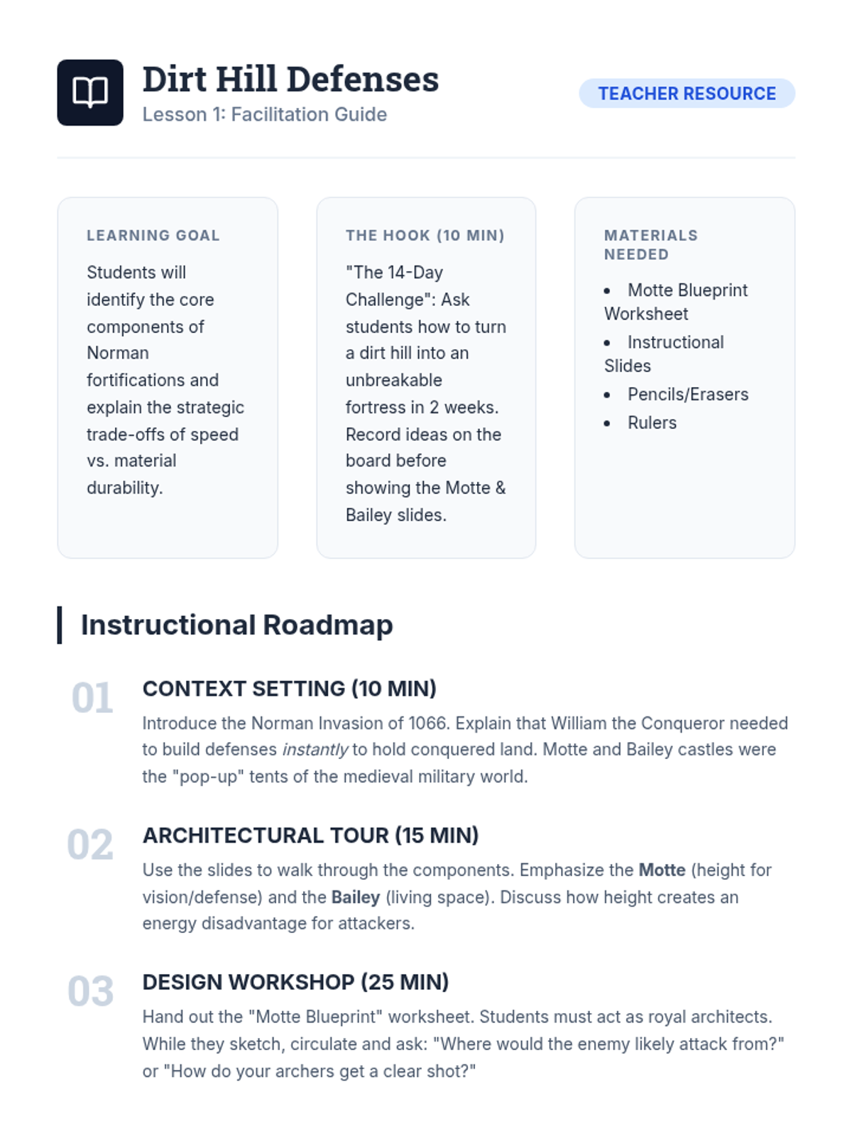 A project-based history and engineering sequence where students design, defend, and analyze medieval castles through the lens of military technology and strategic evolution. Students act as royal architects, evolving their designs from simple wooden mounds to complex stone concentric fortresses.