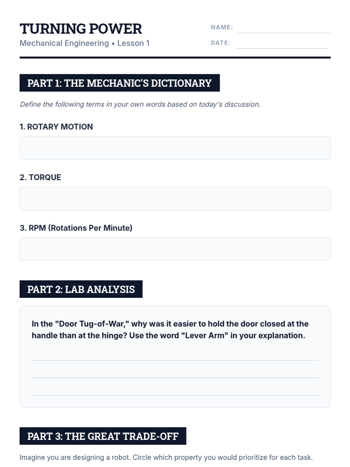 This sequence explores the physical principles of robotics, focusing on kinematics, gear systems, and mechanical advantage. Students will progress from simple machines to designing and testing a motorized chassis for varied terrain.