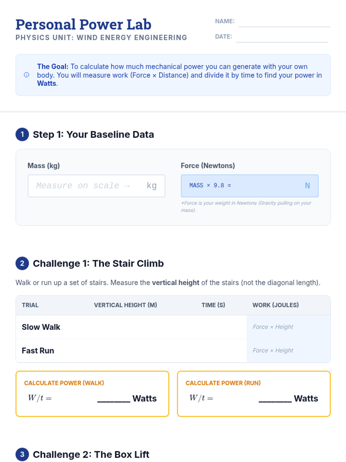 A hands-on physics and engineering unit where 6th-grade students explore the relationship between work, power, and aerodynamics by designing, building, and optimizing wind turbine blades. Students move from calculating their own power output to measuring the electrical efficiency of their engineered prototypes.