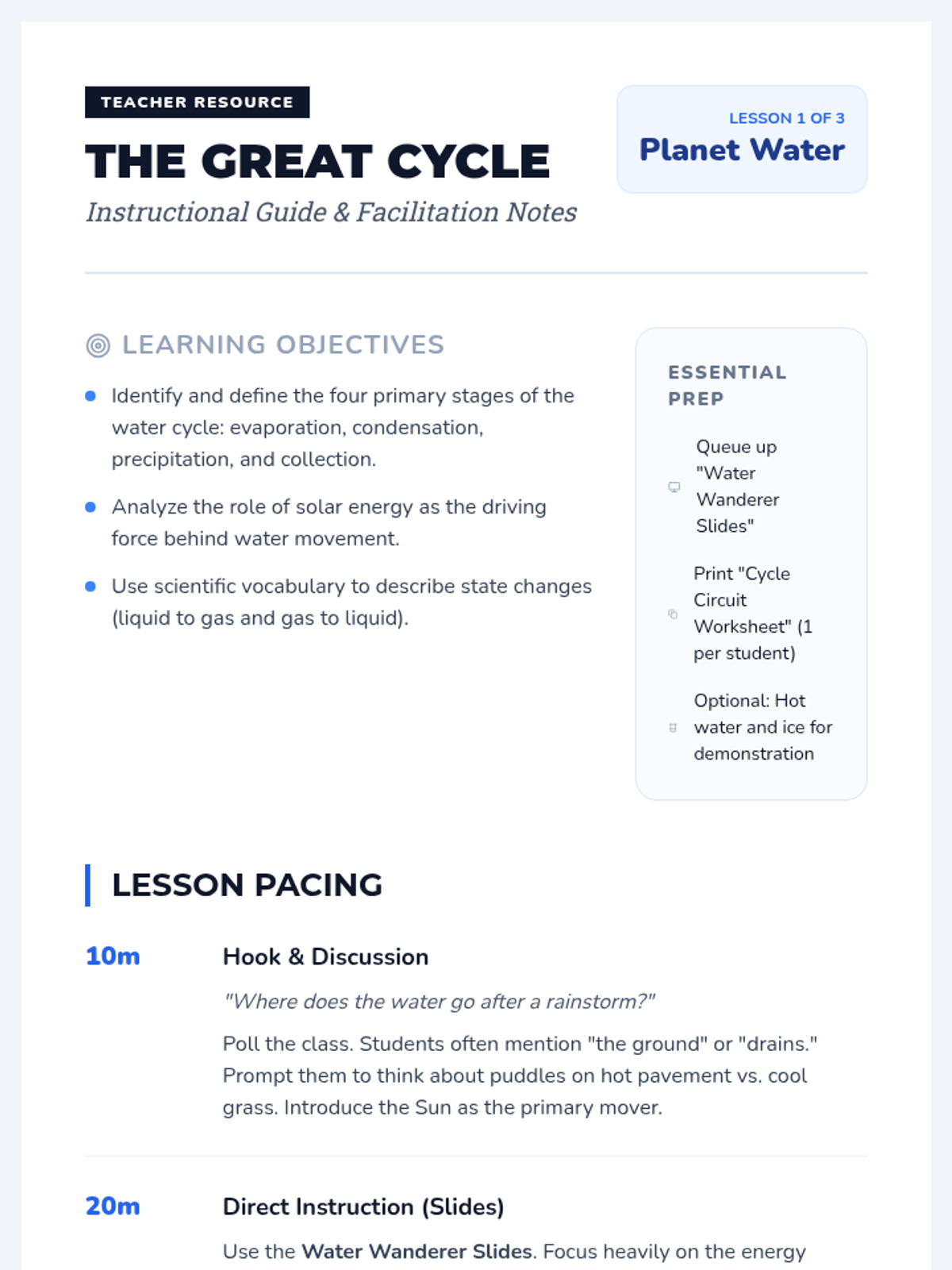 A comprehensive unit exploring the movement of water through Earth's systems, focusing on the processes of evaporation, condensation, precipitation, and collection.