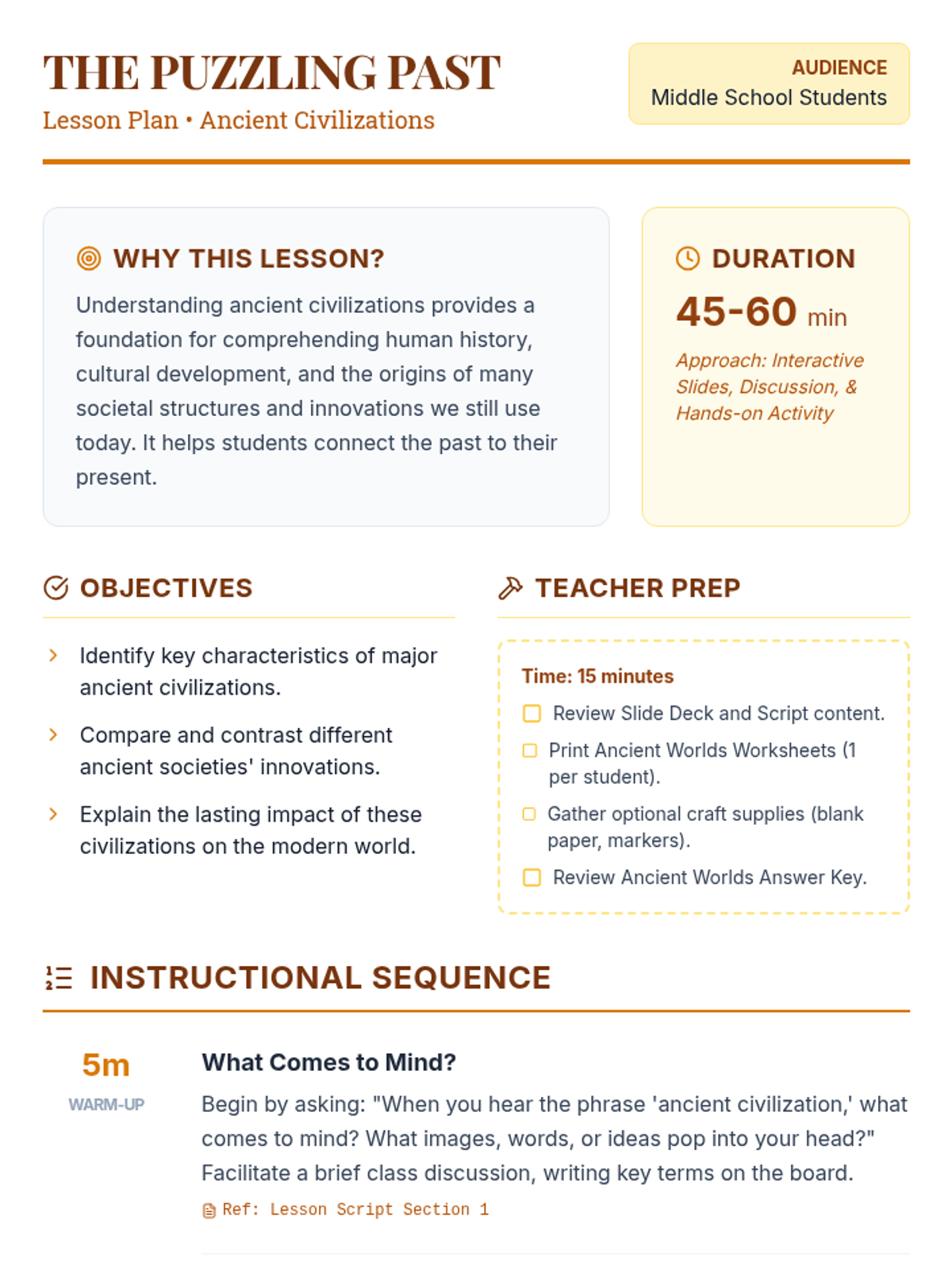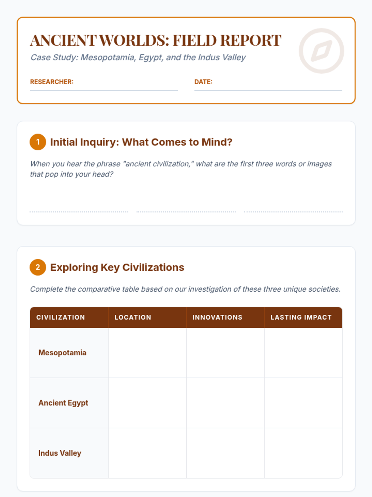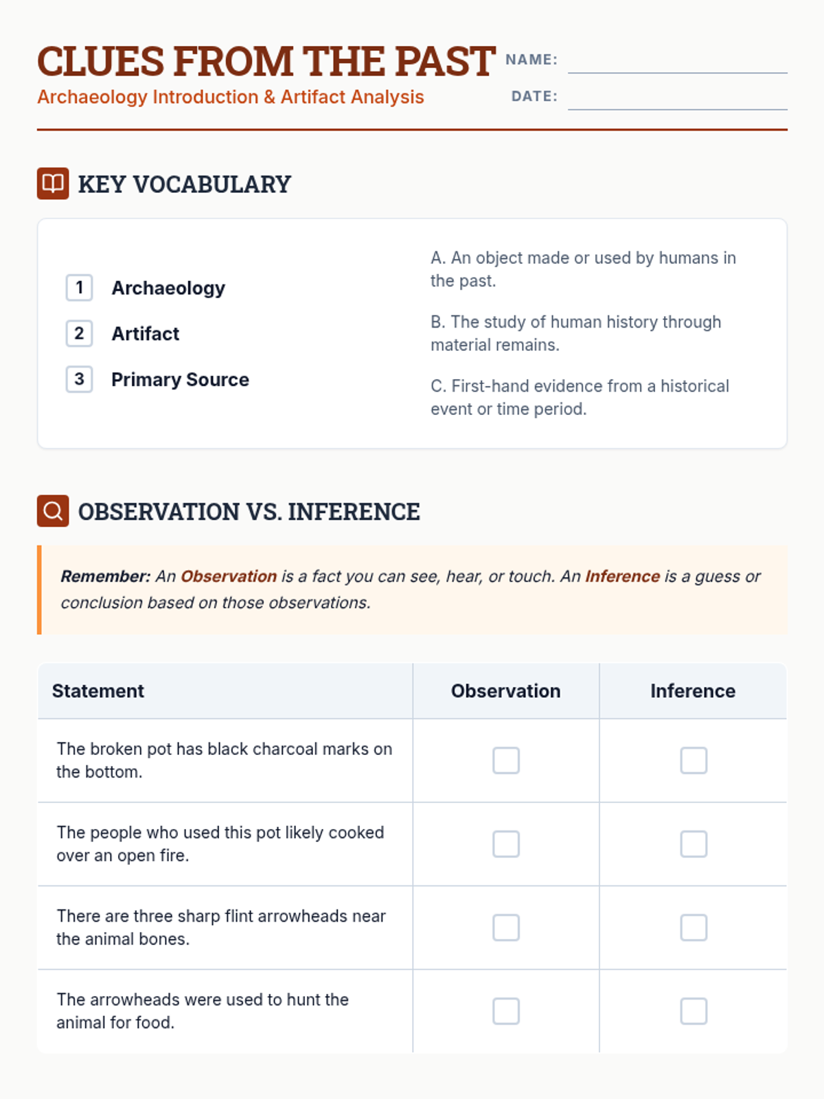 A comprehensive unit for 6th-grade students on the methods and ethics of archaeology. Students move from understanding basic observation to conducting a mock excavation and debating the ownership of historical artifacts.