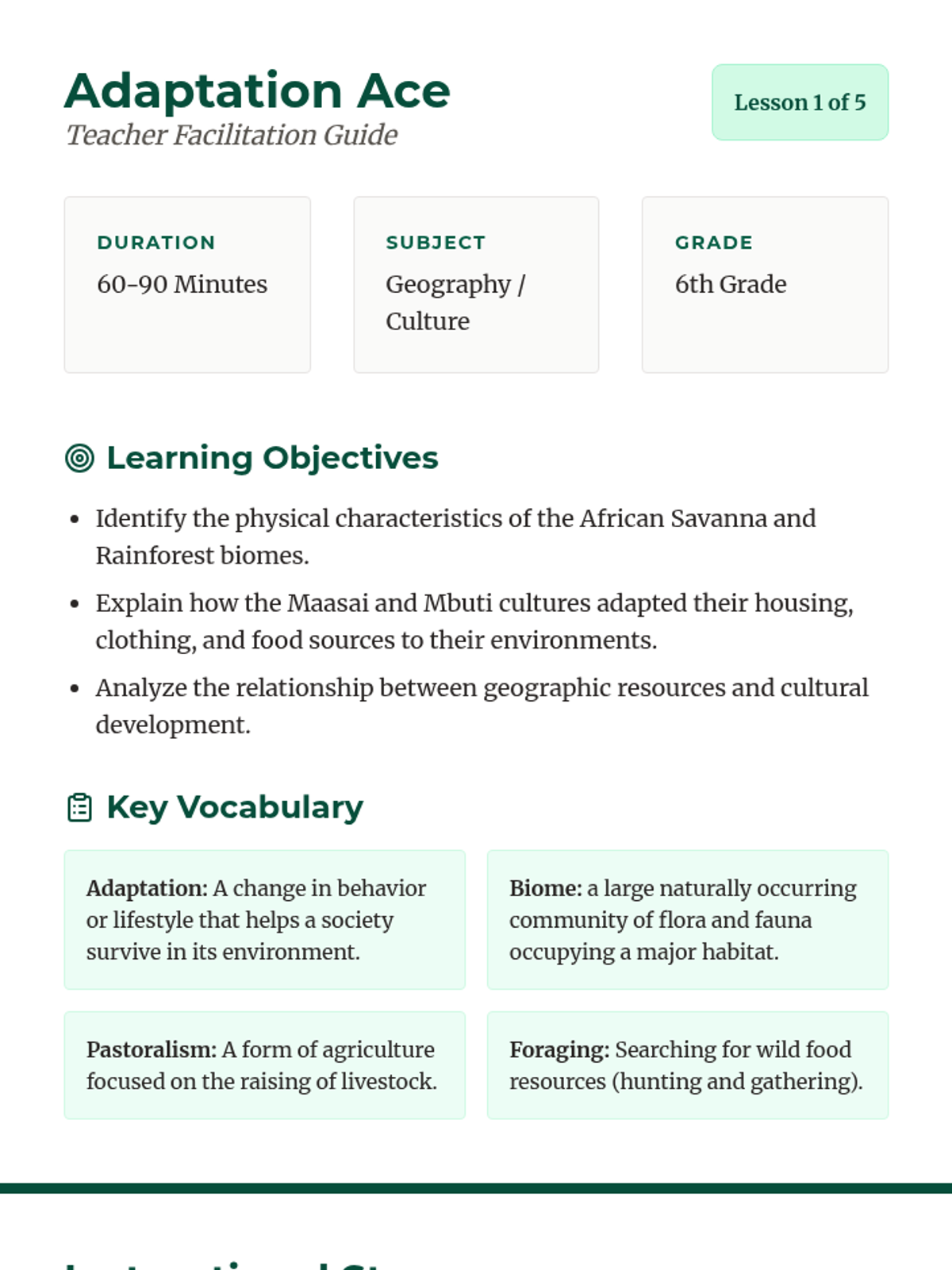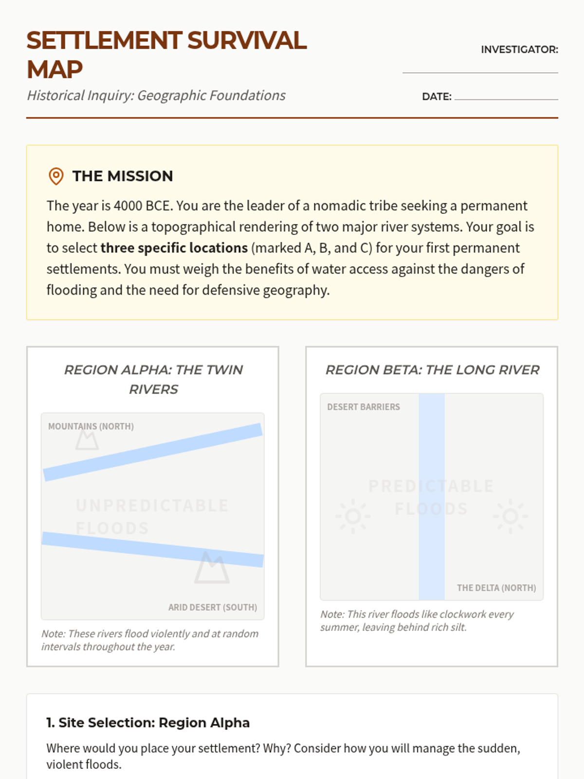 A 5-lesson immersive sequence for 6th graders exploring the Paleolithic era through survival simulations, migration mapping, and game-based learning. Students analyze how geography and climate drove human movement across the globe.