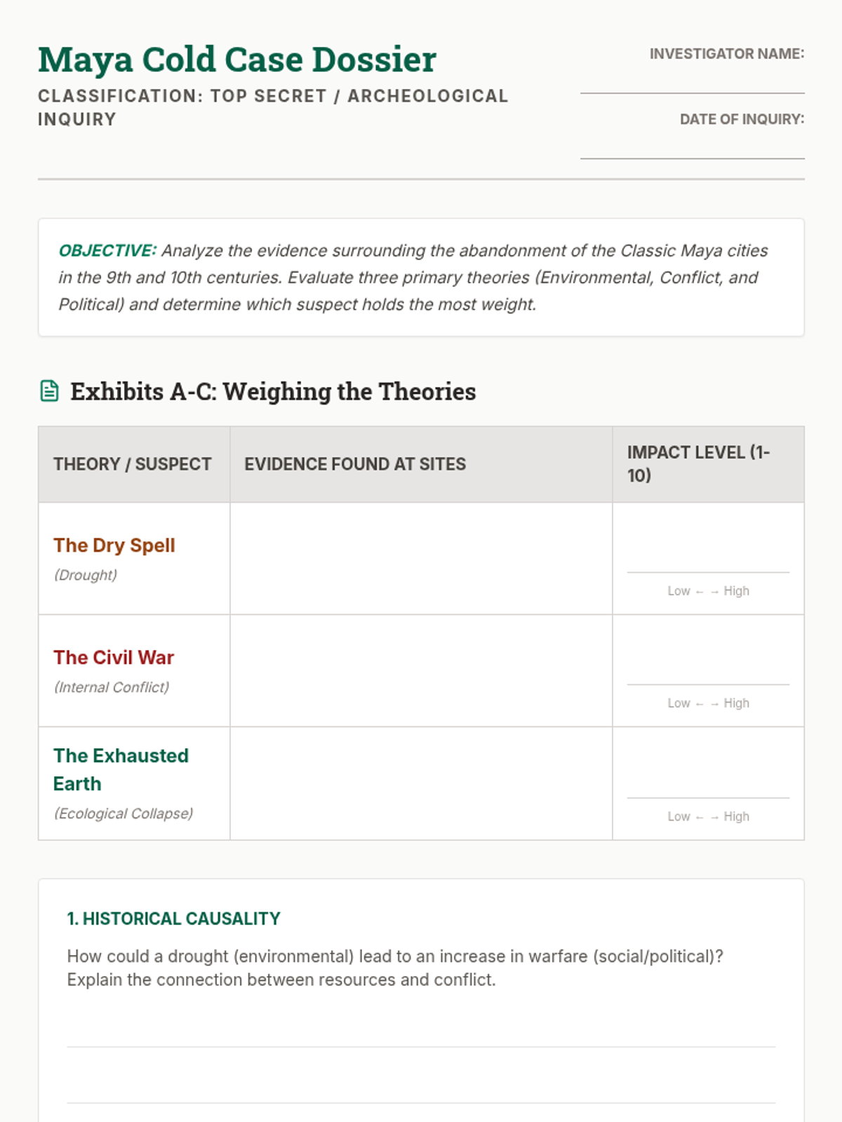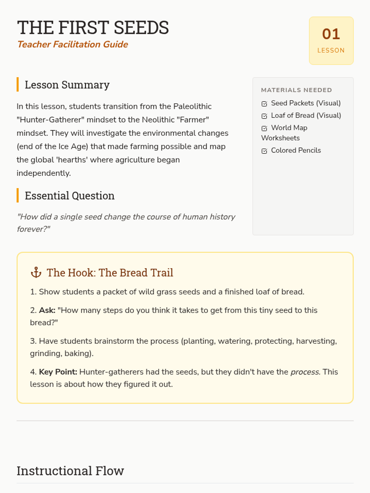 This sequence guides 6th-grade students through the concepts of chronology and causation, moving from simple trigger-outcome identification to complex historical causal mapping, centered on the Neolithic Revolution.