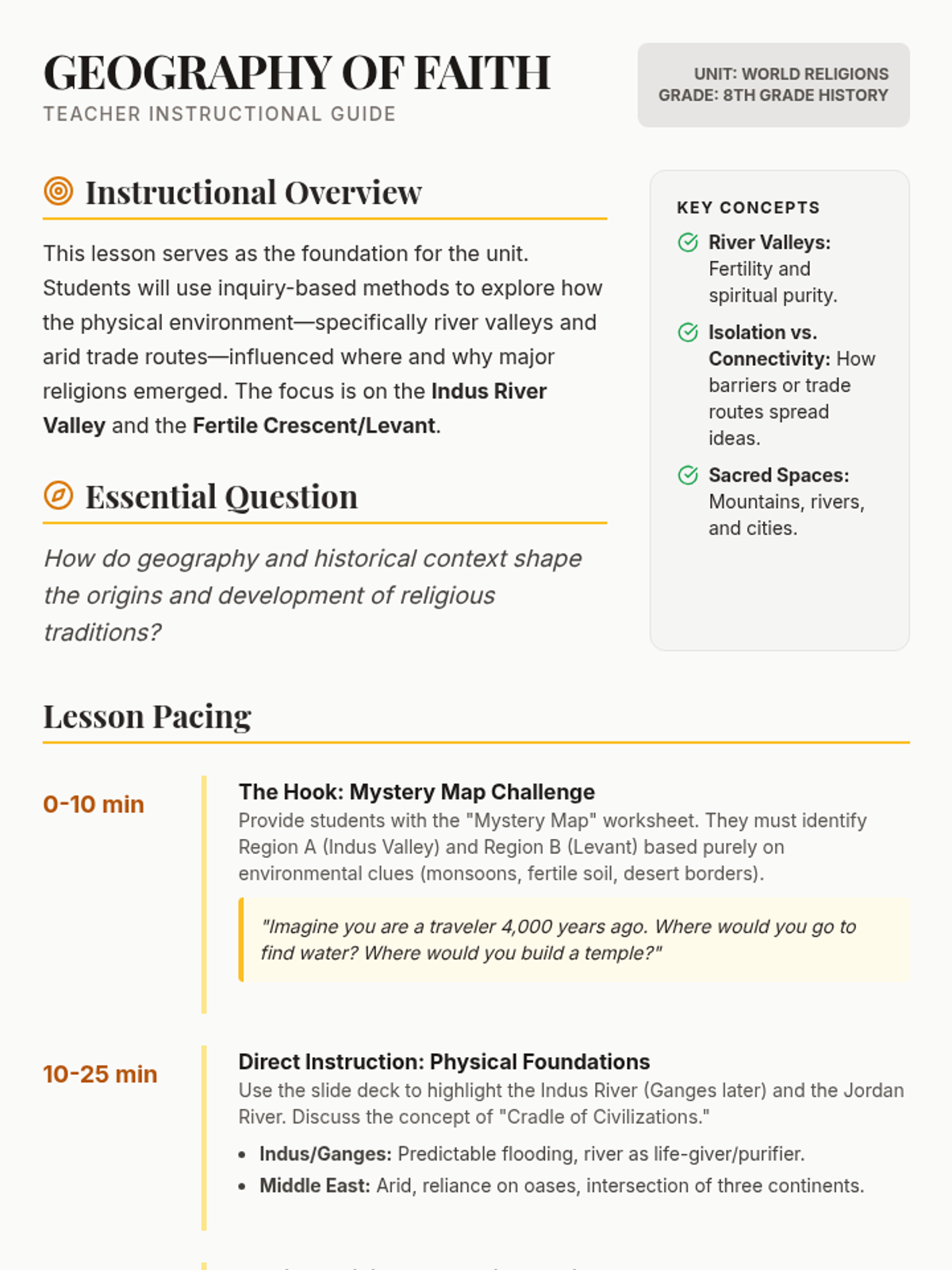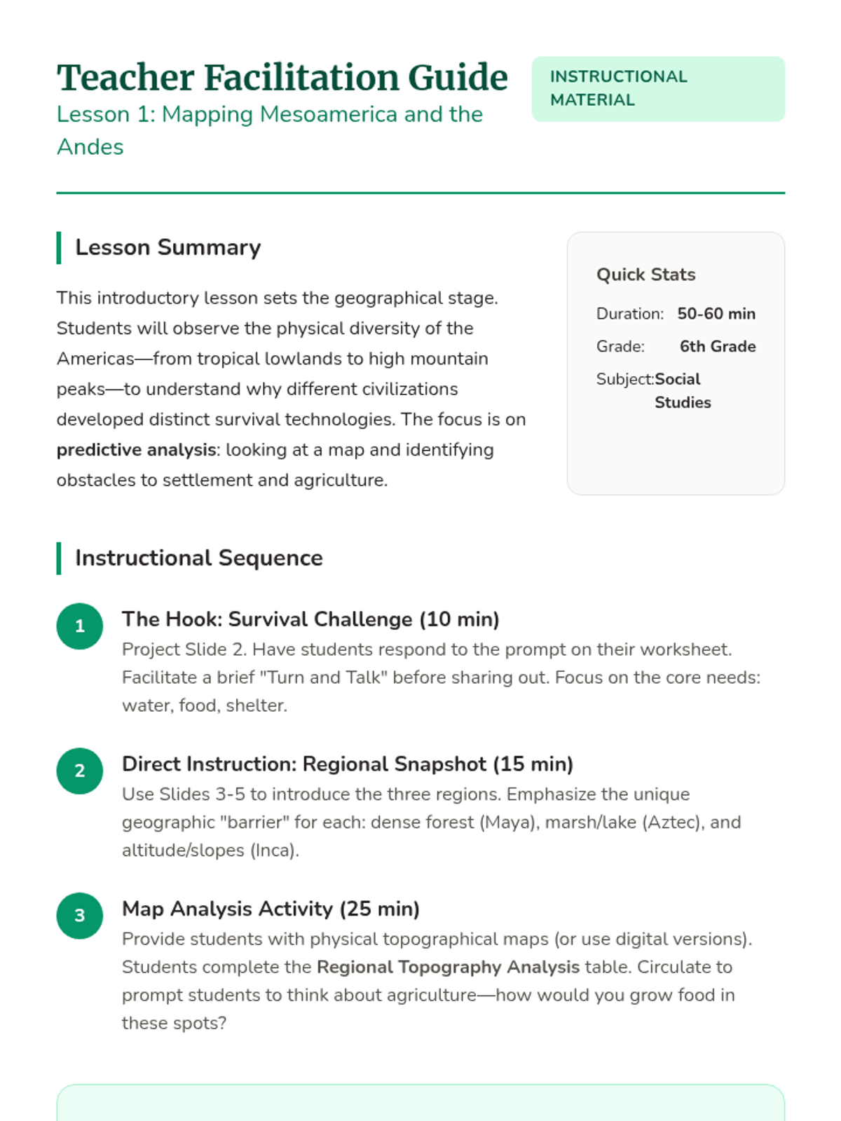 This sequence explores how the Inca Empire adapted to the extreme geography of the Andes Mountains through engineering, administration, and social organization. Students investigate infrastructure like the Qhapaq Ñan, the use of Quipus for record-keeping, and the earthquake-resistant masonry of sites like Machu Picchu.