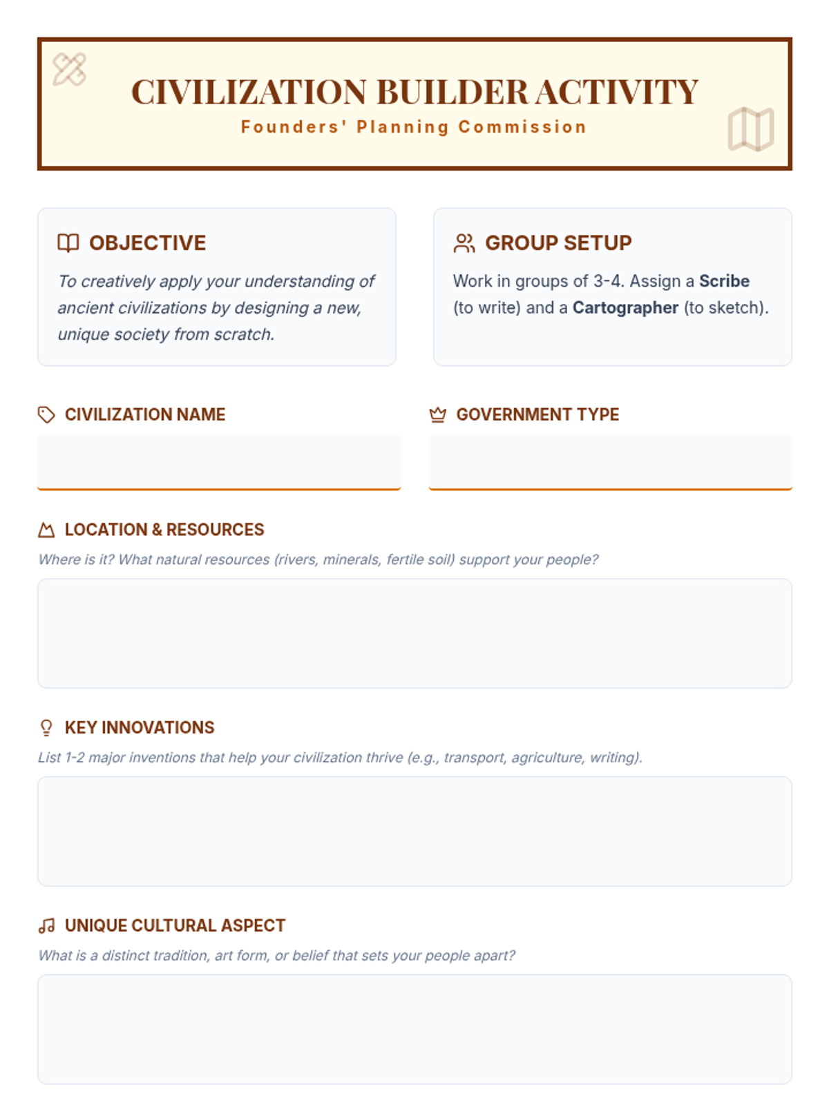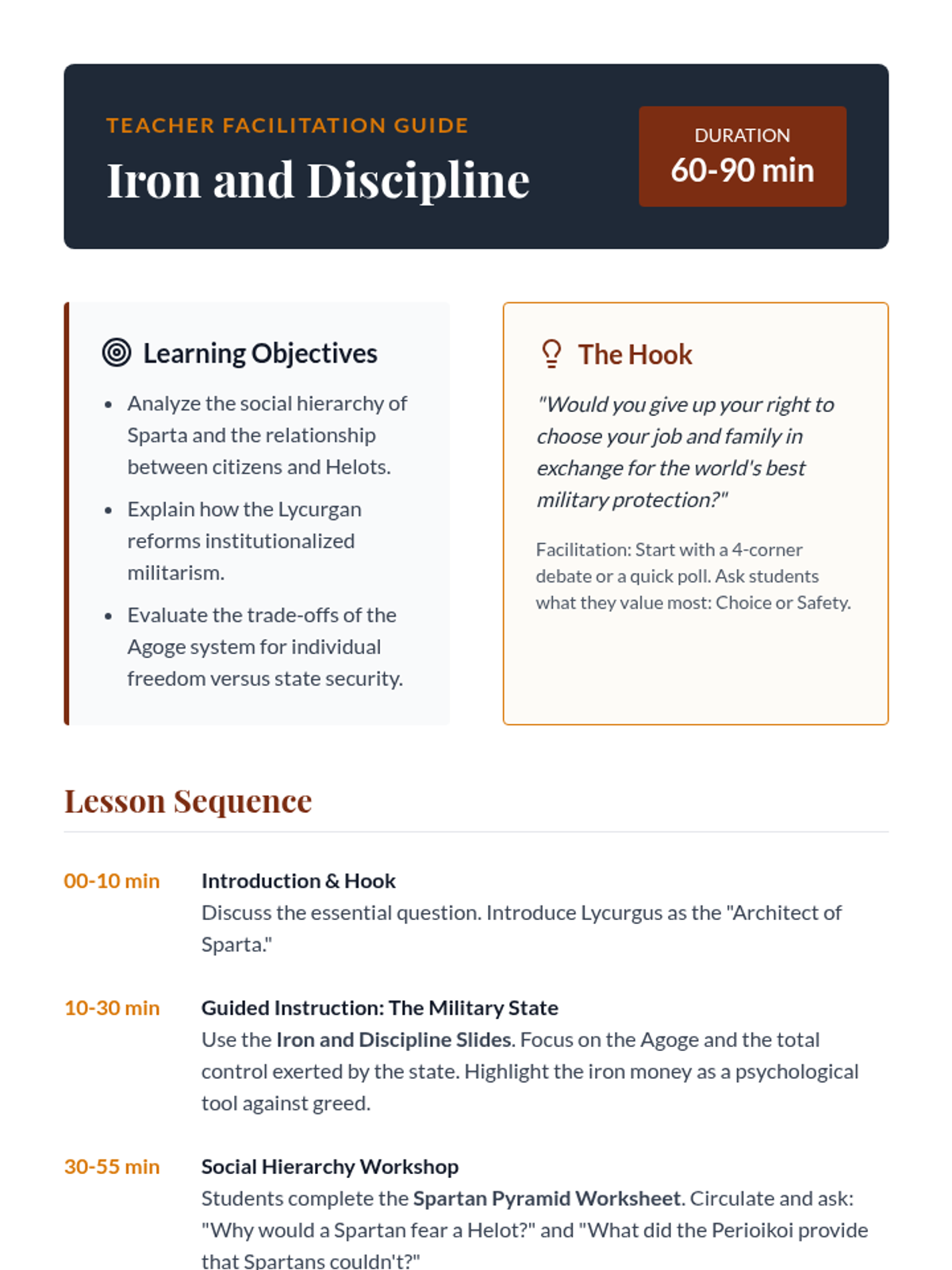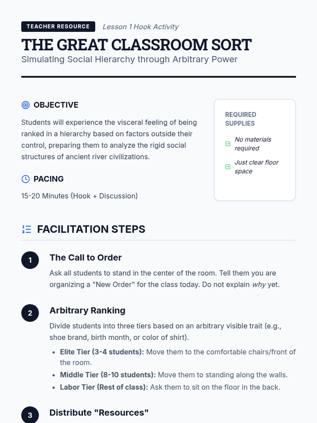 This sequence investigates the rigid social hierarchies and daily life within the Aztec and Inca empires, from the divine power of emperors to the communal systems of the Ayllu. Students analyze how class structures maintained order and conclude with a civic role-play simulation.