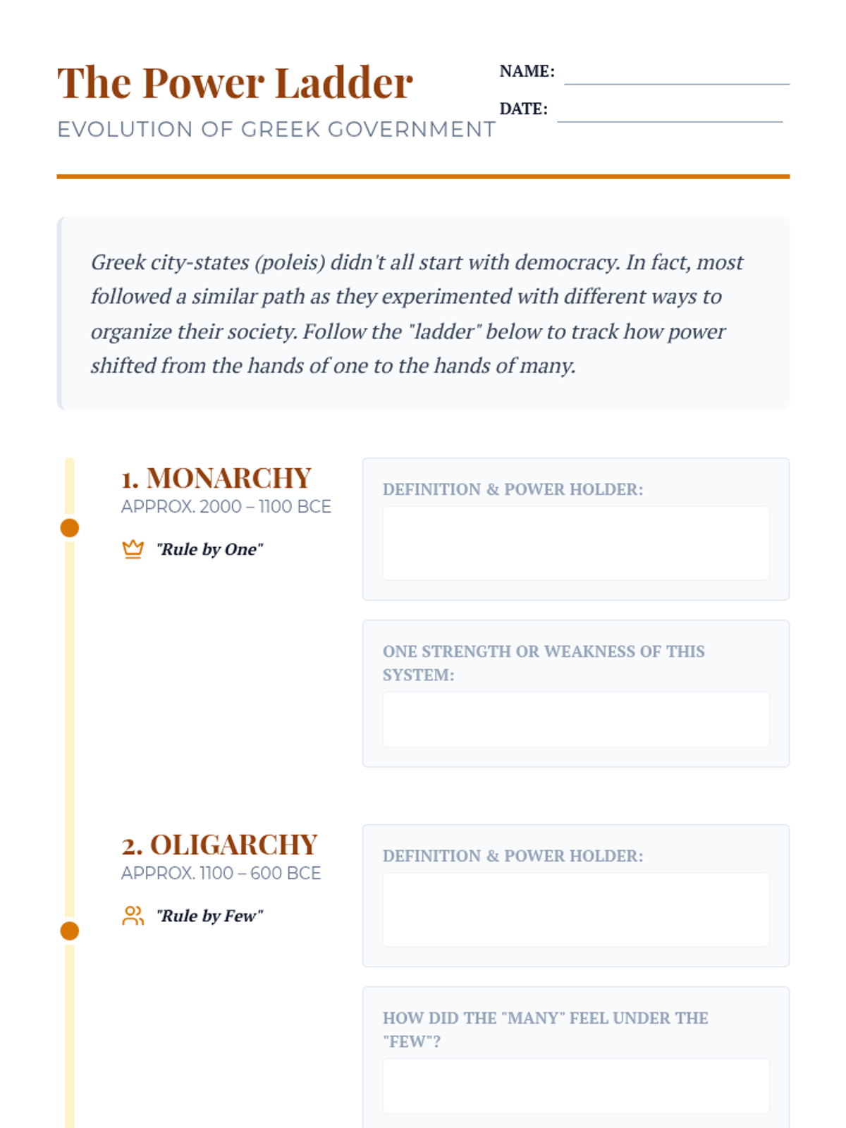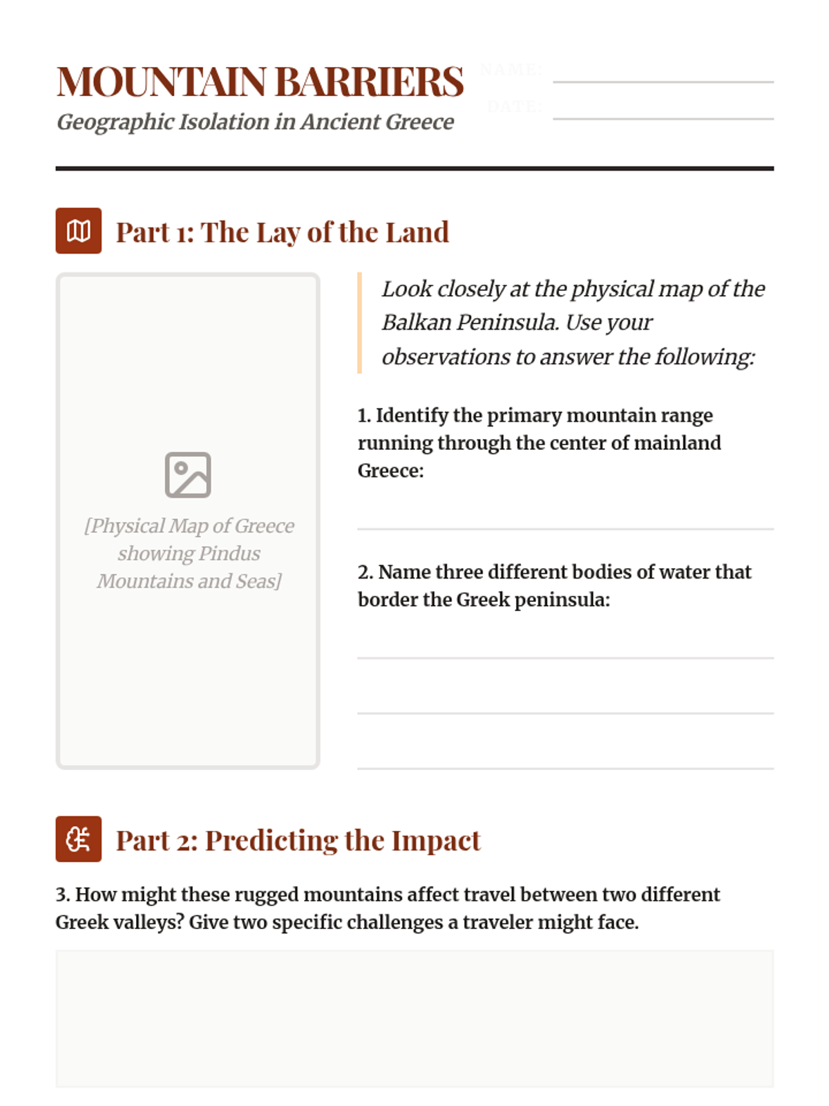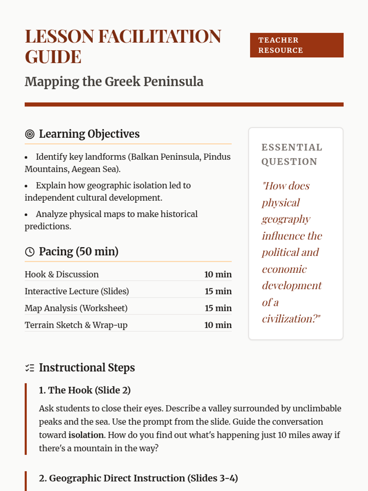 This sequence examines the geographic and early historical foundations of Ancient Greece, moving from the Bronze Age civilizations to the formation of the city-state (polis). Students analyze how the mountainous geography and maritime environment necessitated independent political units rather than a centralized empire.