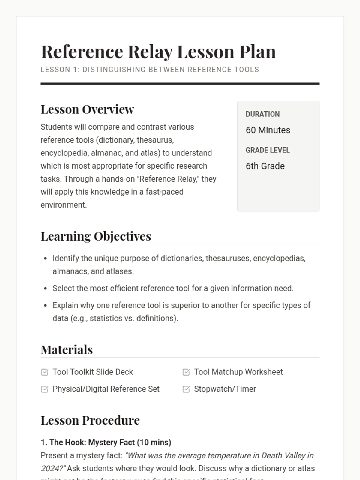 A comprehensive inquiry-driven sequence guiding 6th-grade students through modern information retrieval, from print reference tools to digital search strategies and academic citation.