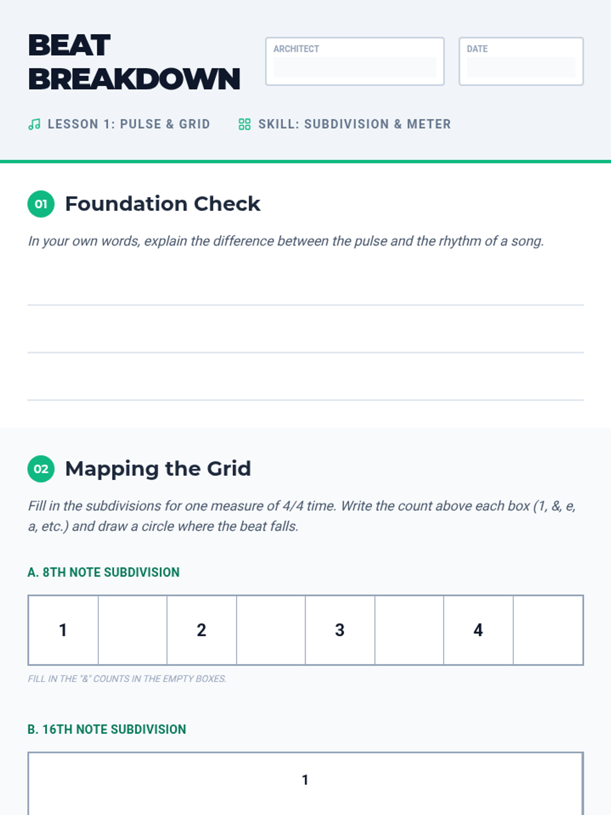 A comprehensive sequence for 6th-grade students on rhythmic notation, meter, and mathematical subdivision of music. Students progress from basic note values to complex syncopation and original composition.