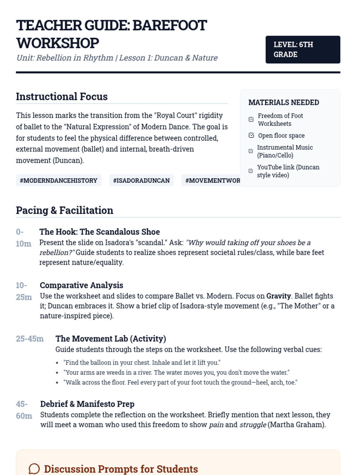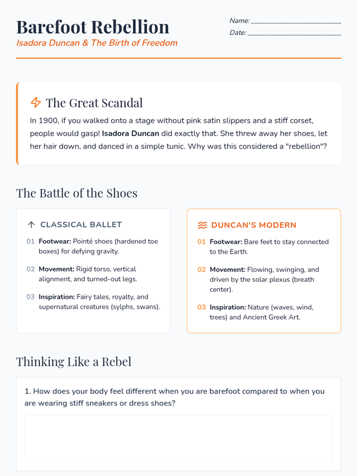 A 5-lesson unit exploring the 20th-century rebellion against ballet that birthed Modern and Contemporary dance. Students analyze pioneers like Duncan, Graham, and Ailey, experimenting with movement innovations and culminating in their own 'rule-breaking' choreographic project.