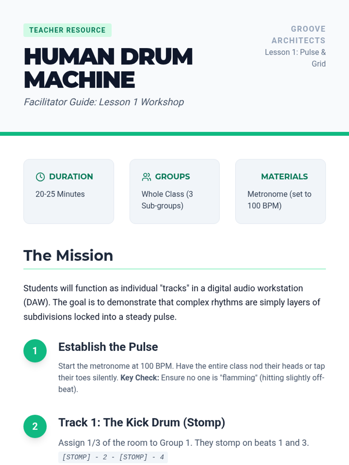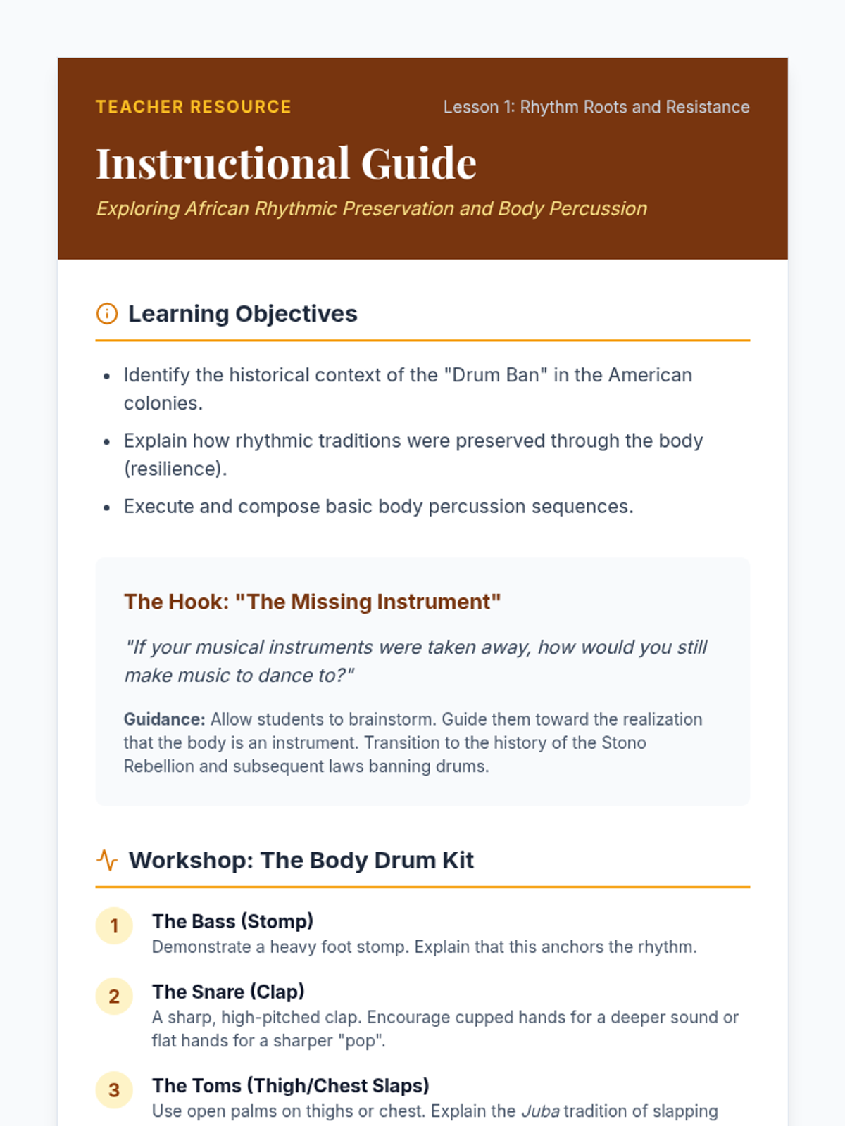 A comprehensive 5-lesson sequence for 7th-grade students on the fundamentals of rhythm, exploring subdivision, syncopation, ostinatos, and polyrhythms, culminating in an original percussion ensemble composition.