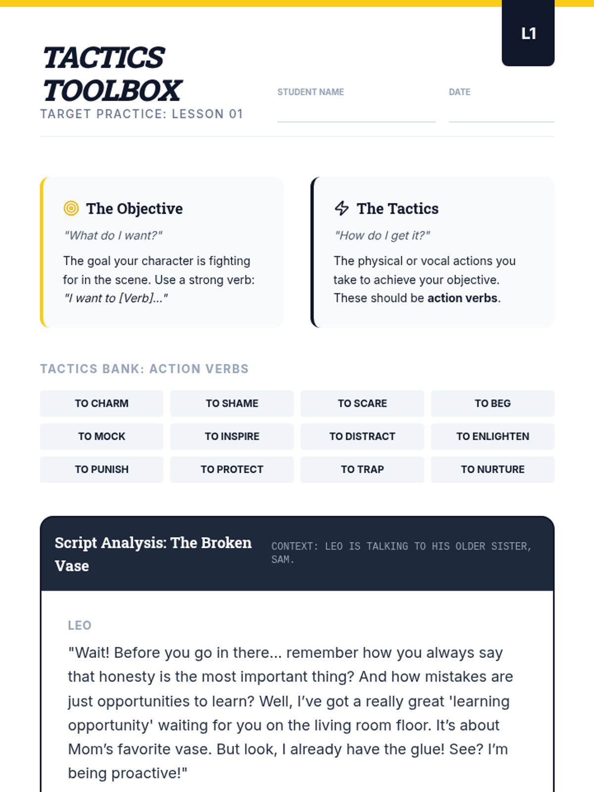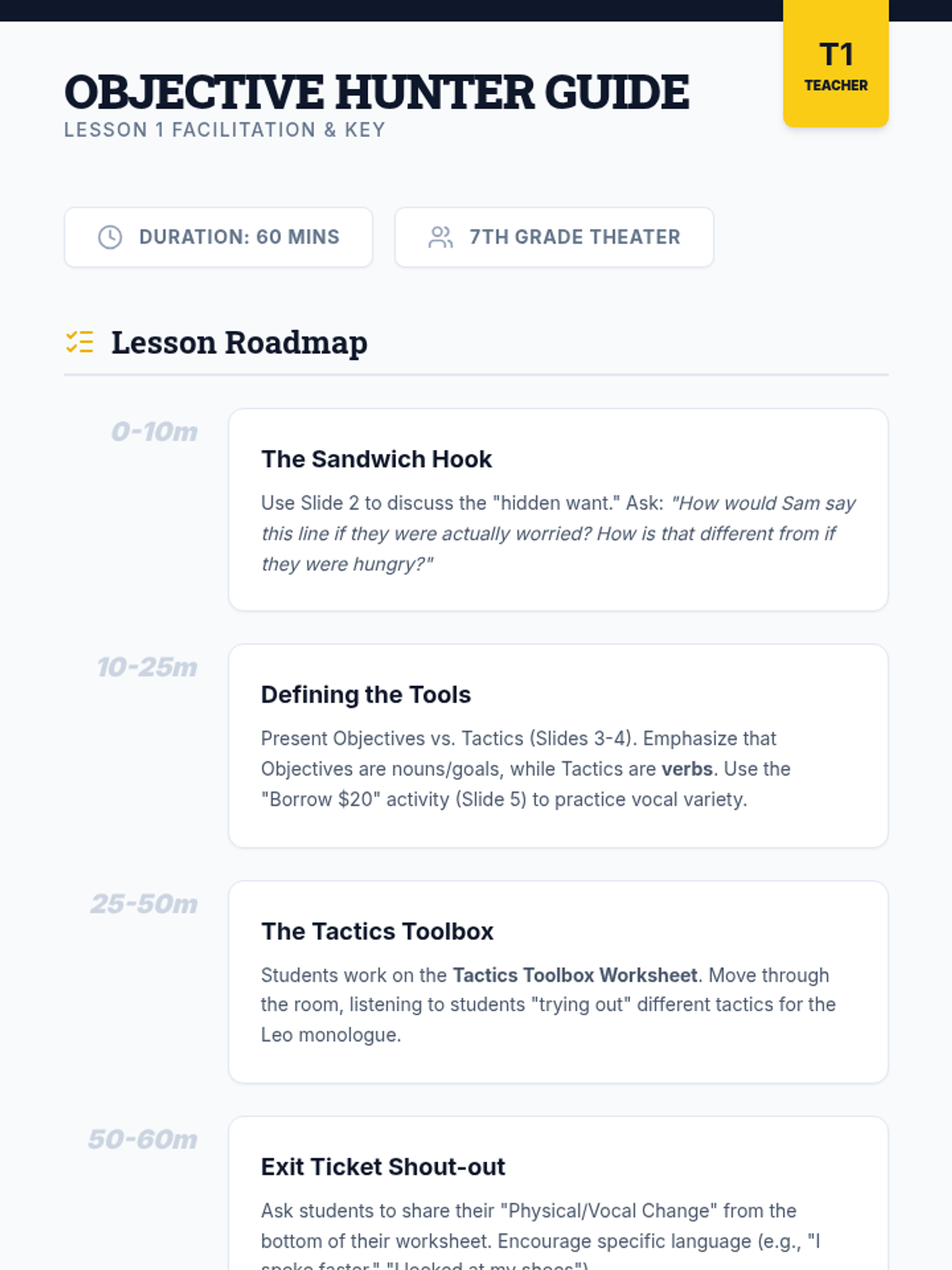 This 7th-grade theater sequence guides students from initial script analysis to a polished monologue or duologue performance. Students master 'beats,' objectives, tactics, and subtext, learning to ground their acting choices in the text.