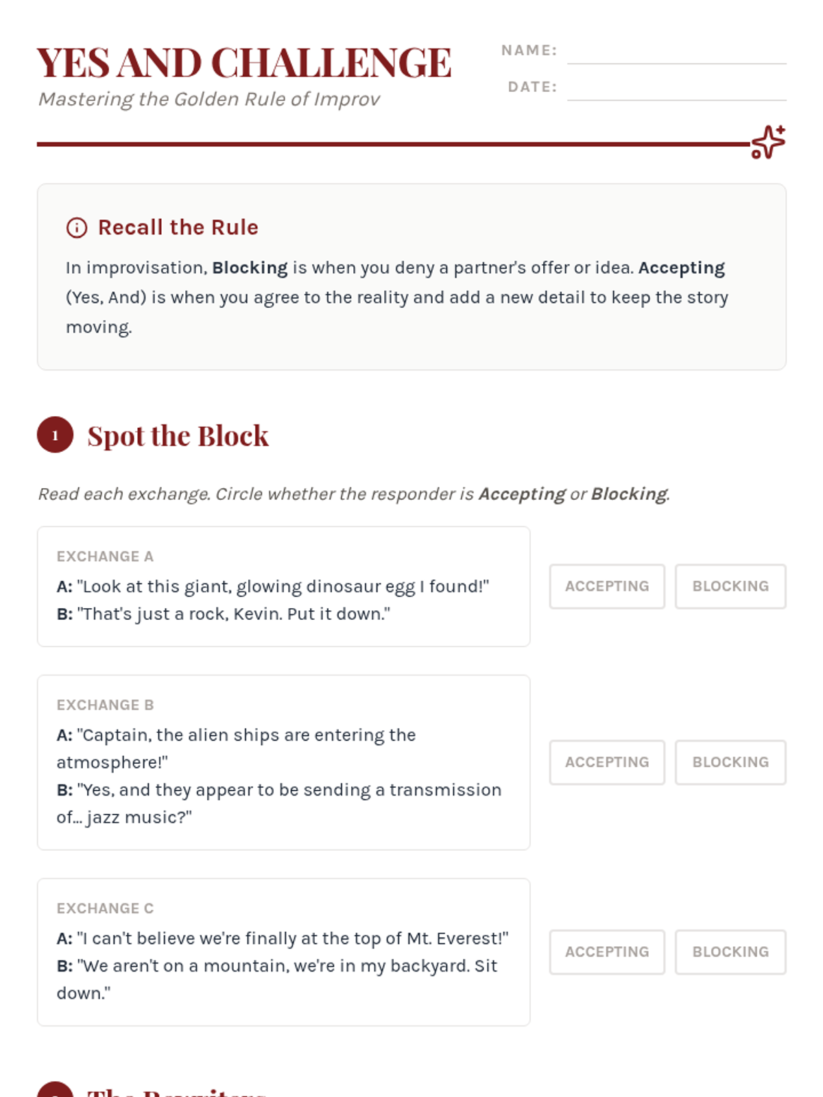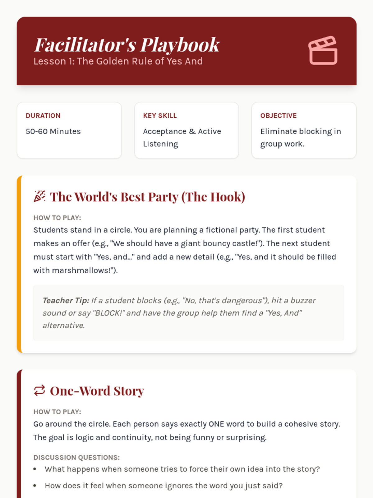 This sequence develops improvisation skills and ensemble collaboration, teaching students to react authentically in the moment. Students build trust and creative confidence by practicing 'Yes, And,' establishing environments, and solving narrative problems as a team.
