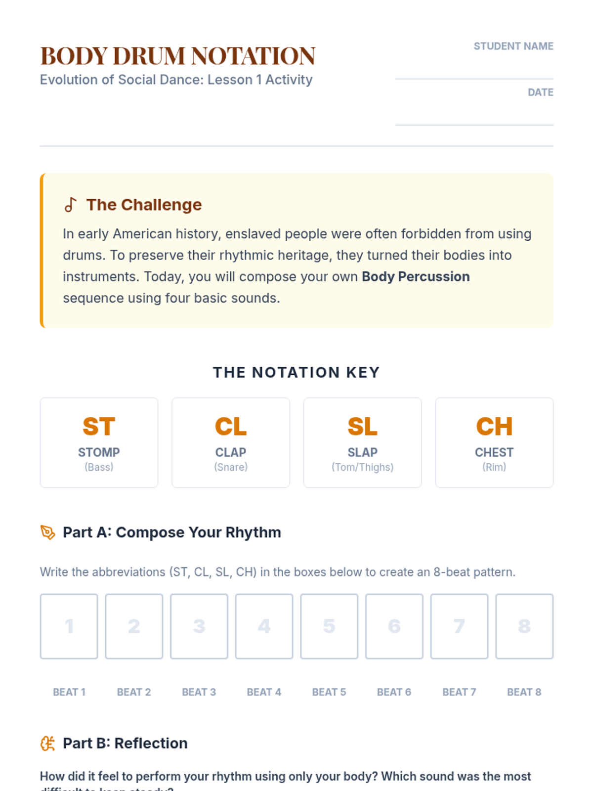 Students explore the history of American social dance, focusing on the cultural fusion and resilience of marginalized communities that birthed Jazz, Tap, and Hip Hop. The sequence covers rhythmic roots, the Cakewalk, the Harlem Renaissance, and the Bronx origins of Hip Hop, culminating in a historical timeline project.
