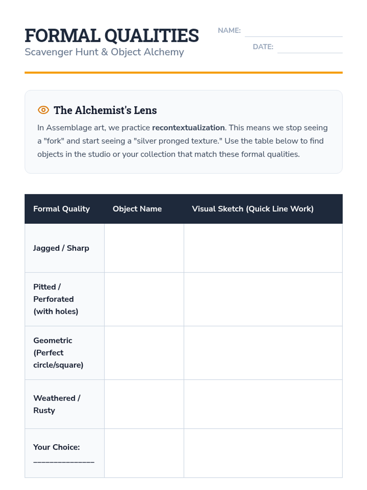 A comprehensive unit on Assemblage Art where 6th-grade students explore the transformation of found objects into cohesive sculptural narratives. The sequence covers art history, composition principles, mechanical fastening techniques, and the use of monochromatic finishes to create unified mixed-media works.