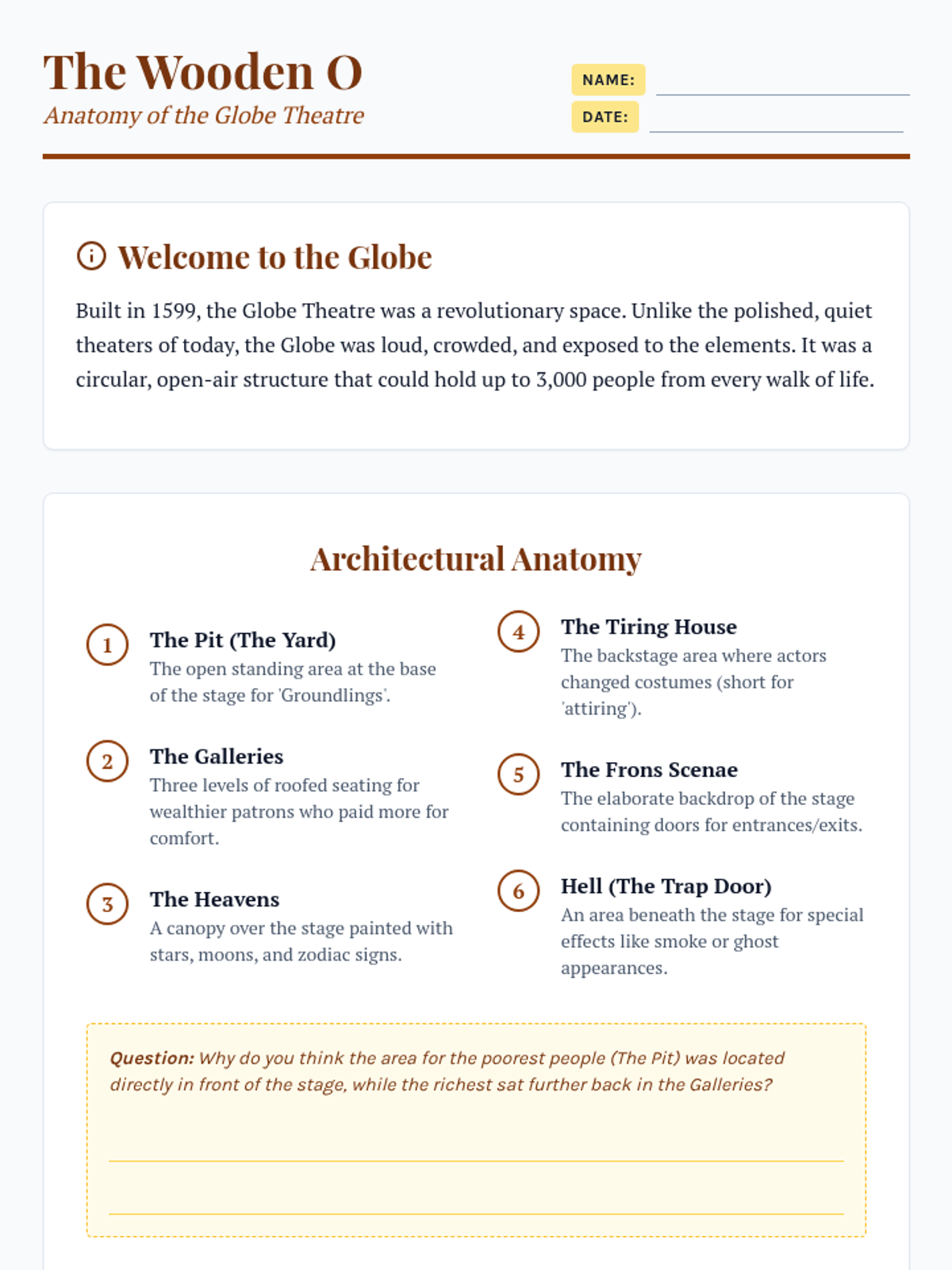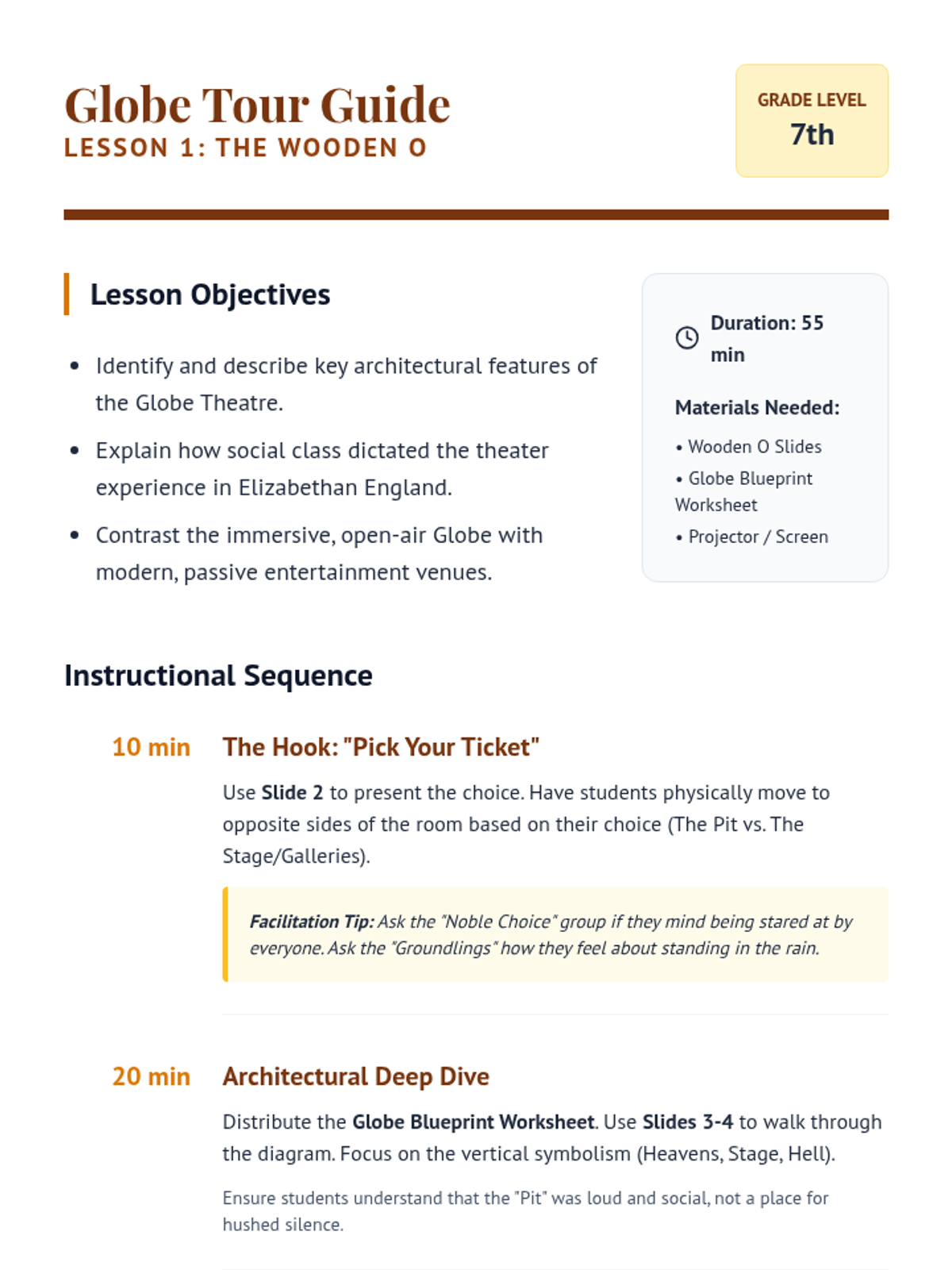 A 5-lesson unit exploring the unique staging conditions of the Elizabethan era and how they shaped Shakespeare's playwriting through language, architecture, and audience interaction.