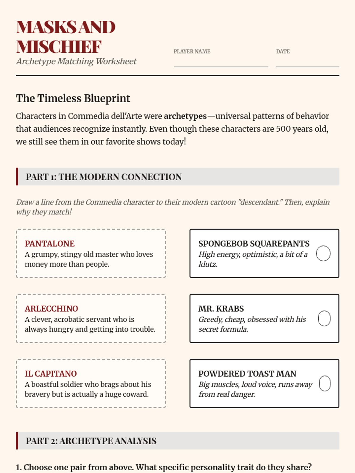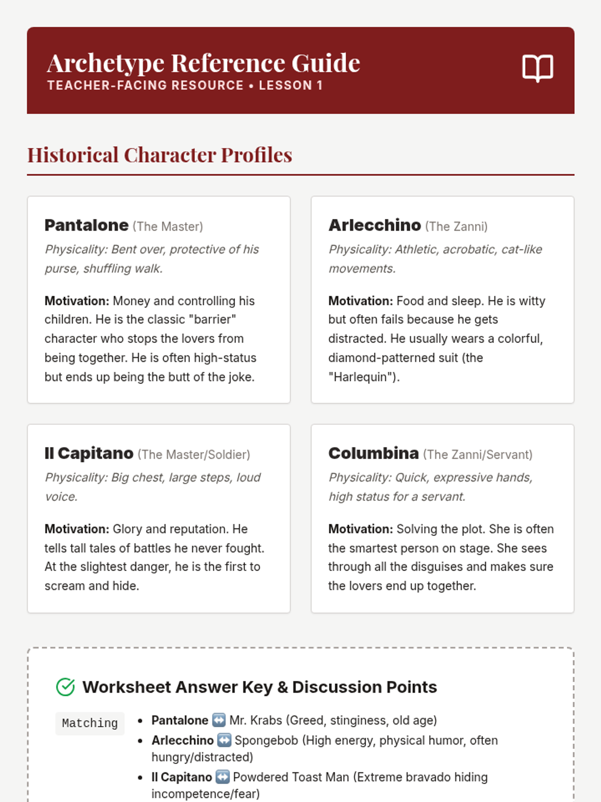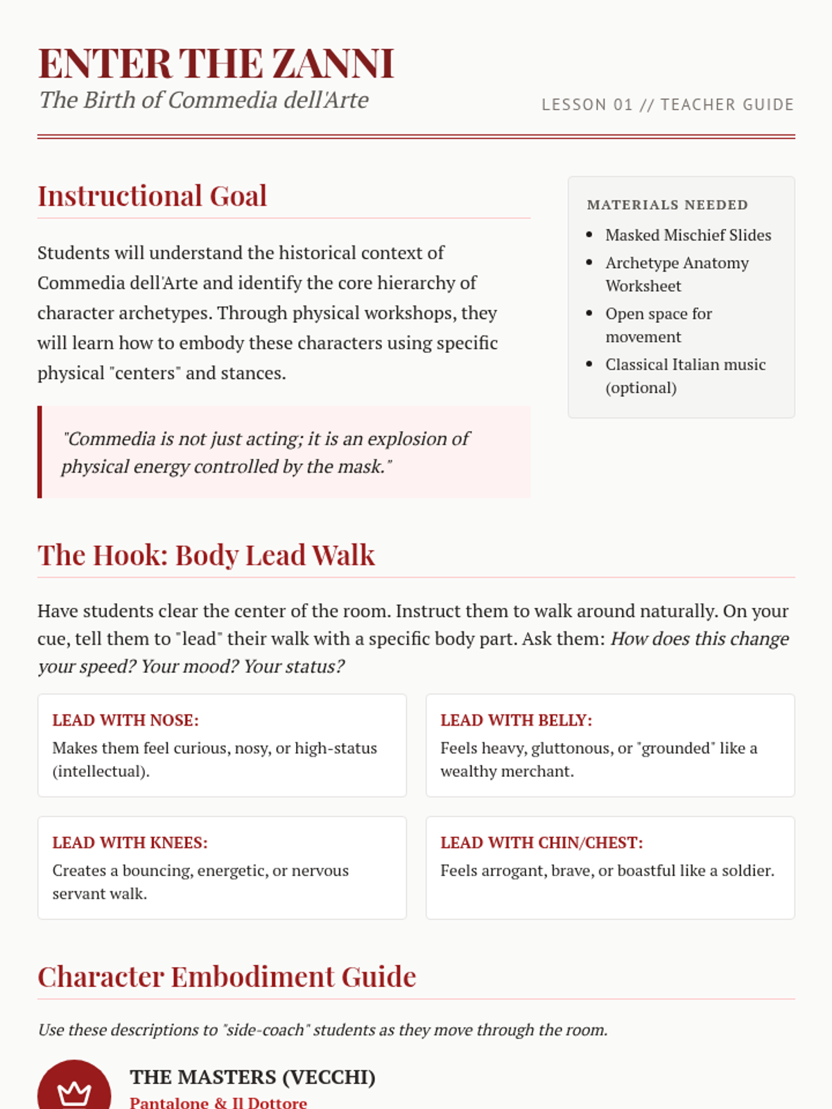 A high-energy exploration of Commedia dell'Arte for 6th graders, focusing on physical archetypes, social hierarchy, and the art of 'lazzi' to understand how historical stock characters influence modern comedy.
