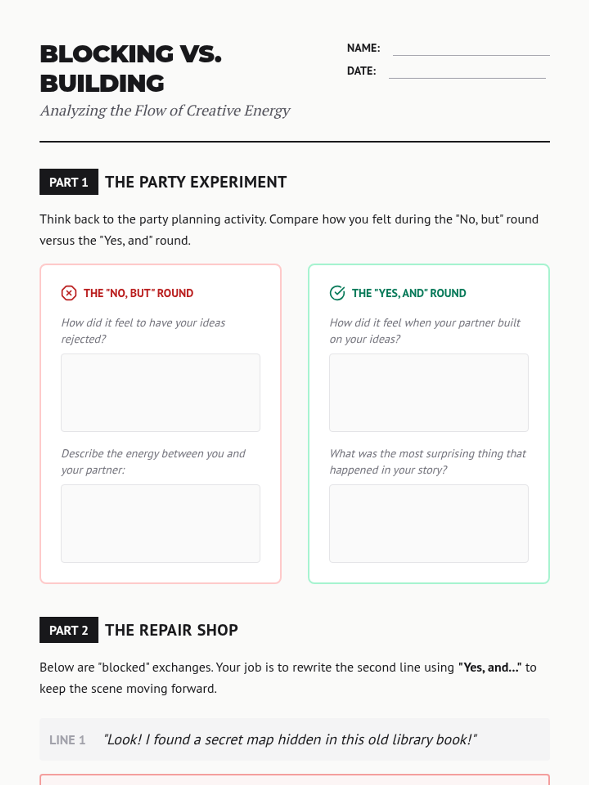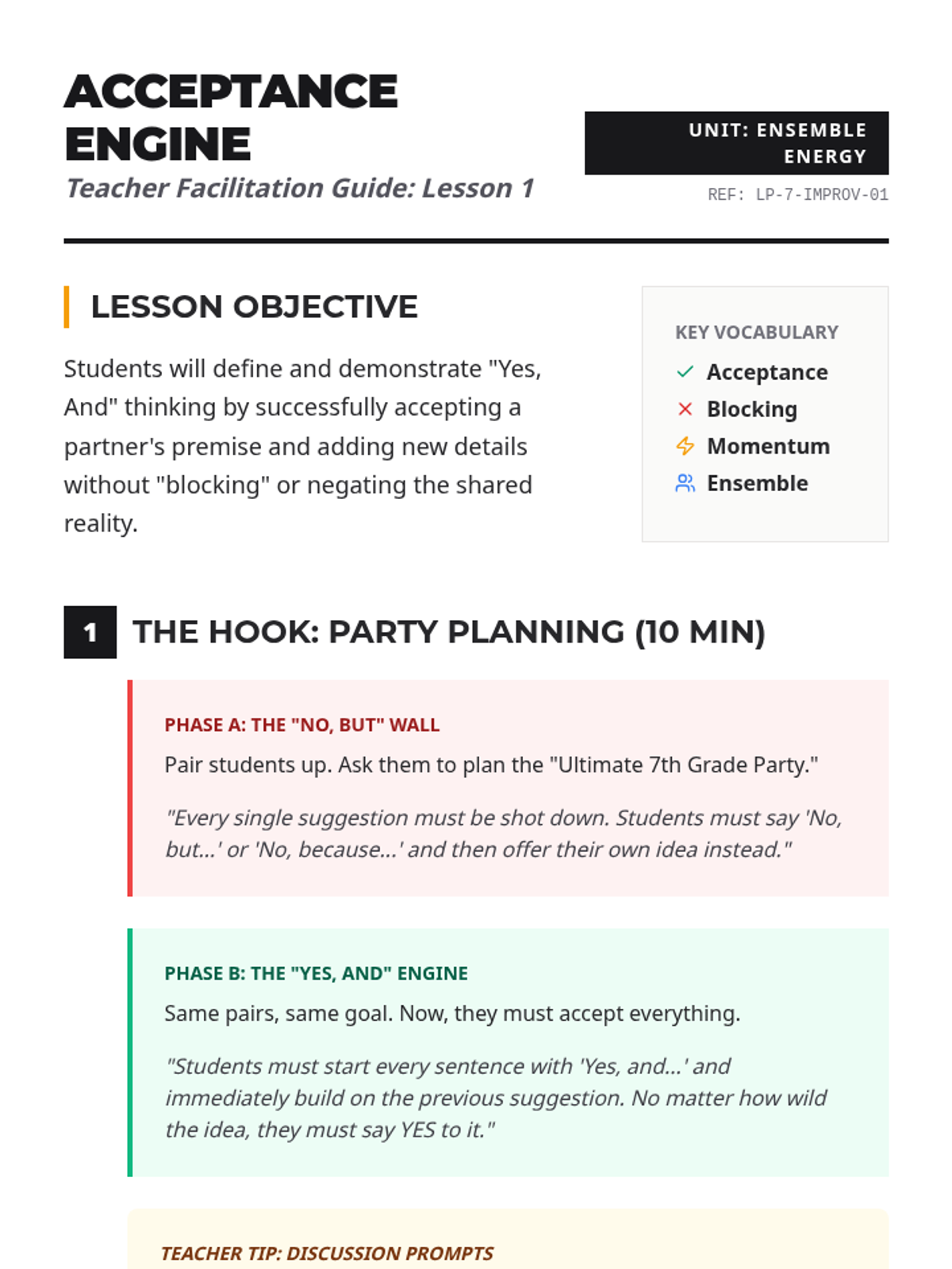 This sequence develops improvisation skills and ensemble collaboration, teaching students to react authentically in the moment. Students build trust and creative confidence by practicing 'Yes, And,' establishing environments, and solving narrative problems as a team.