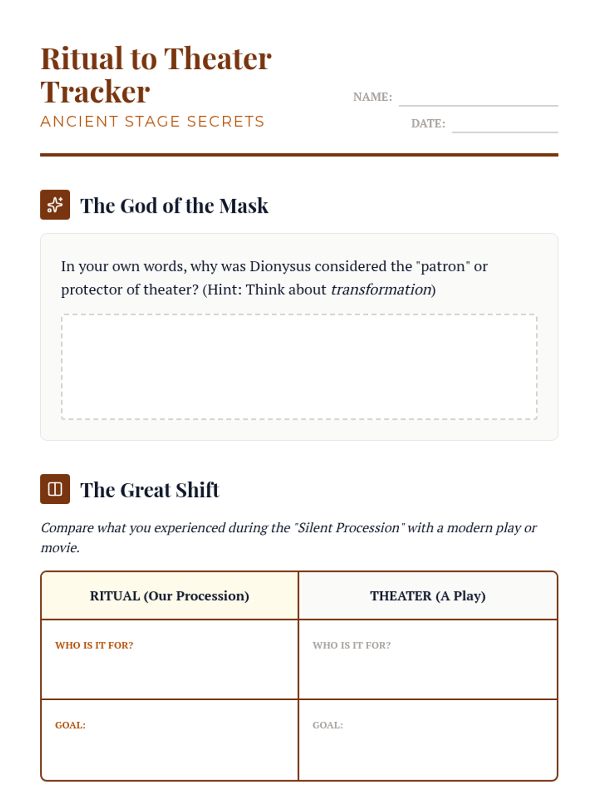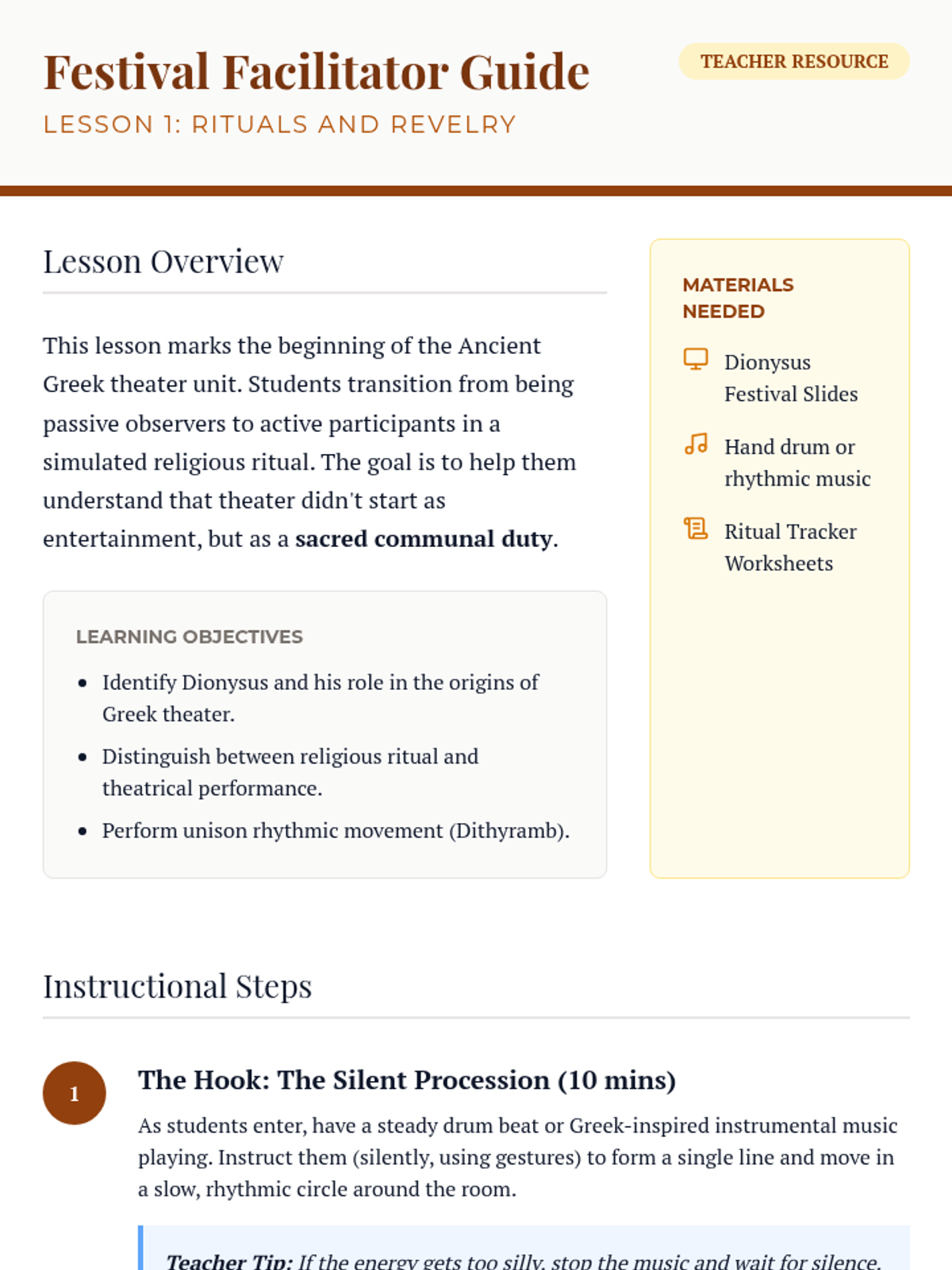 A 5-lesson unit for 6th-grade theater students exploring the ritual origins, physical conventions, and architectural innovations of Ancient Greek theater. Students learn how masks, the chorus, and amphitheaters shaped storytelling.