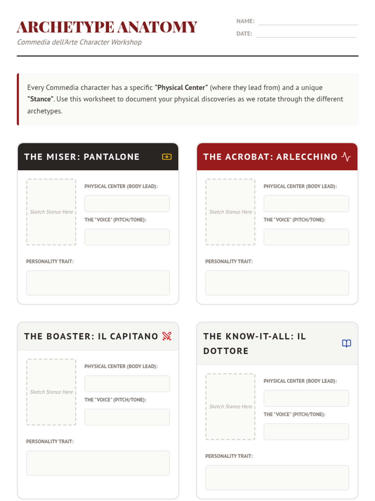 This unit explores the history of physical comedy, from the masked archetypes of Italian Commedia dell'Arte to modern slapstick and sitcoms. Students develop physical characterization skills, understand status dynamics, and learn to identify recurring comic archetypes across theater history.