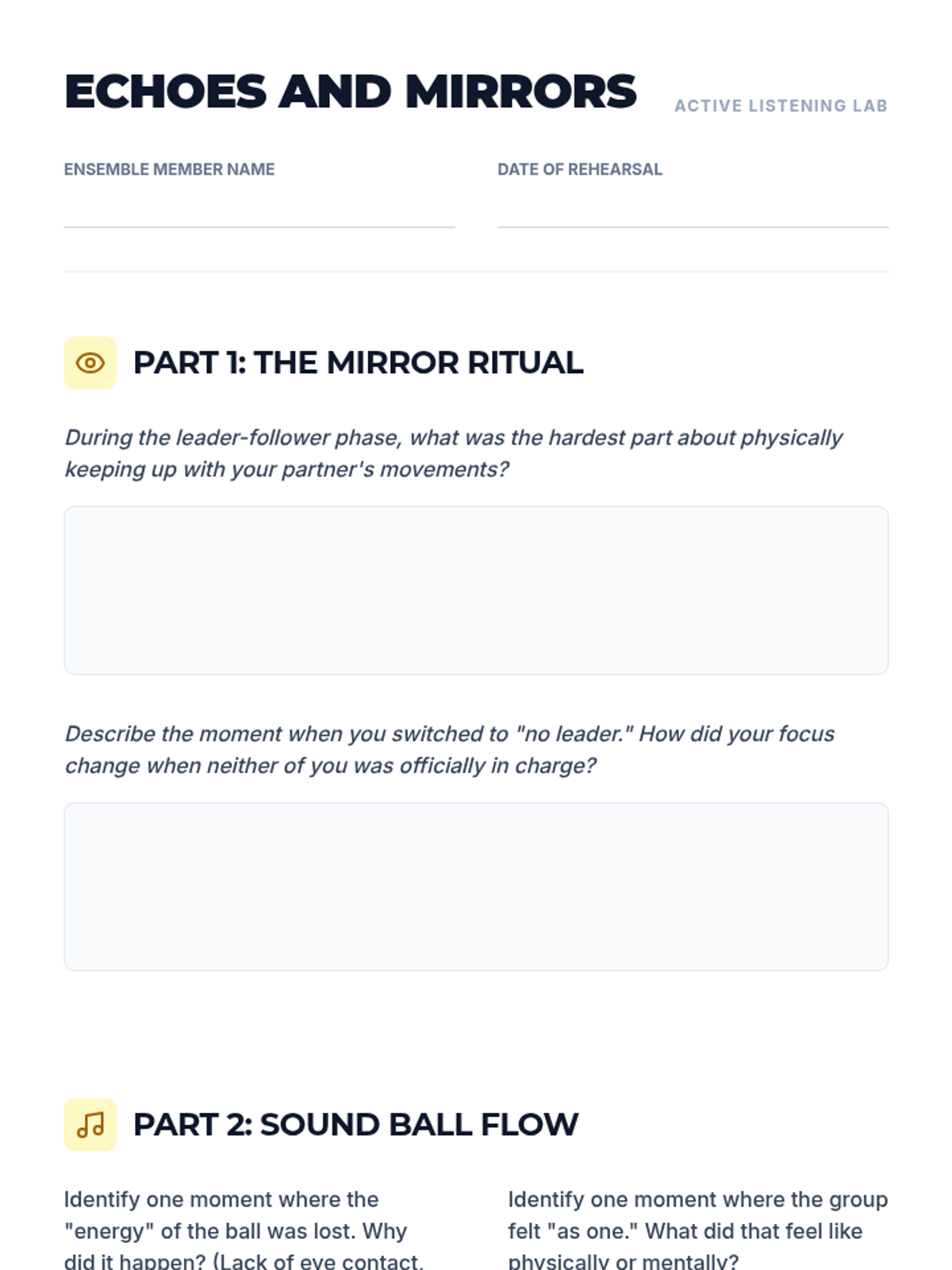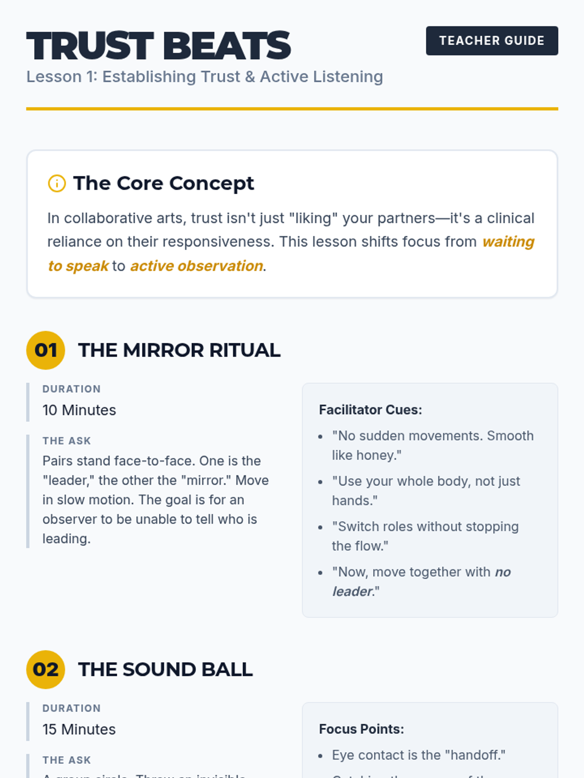 A middle school theater and creative thinking unit focused on building trust, active listening, and collaborative agility through improvisational techniques. Students progress from basic focus exercises to devising and performing original ensemble pieces.